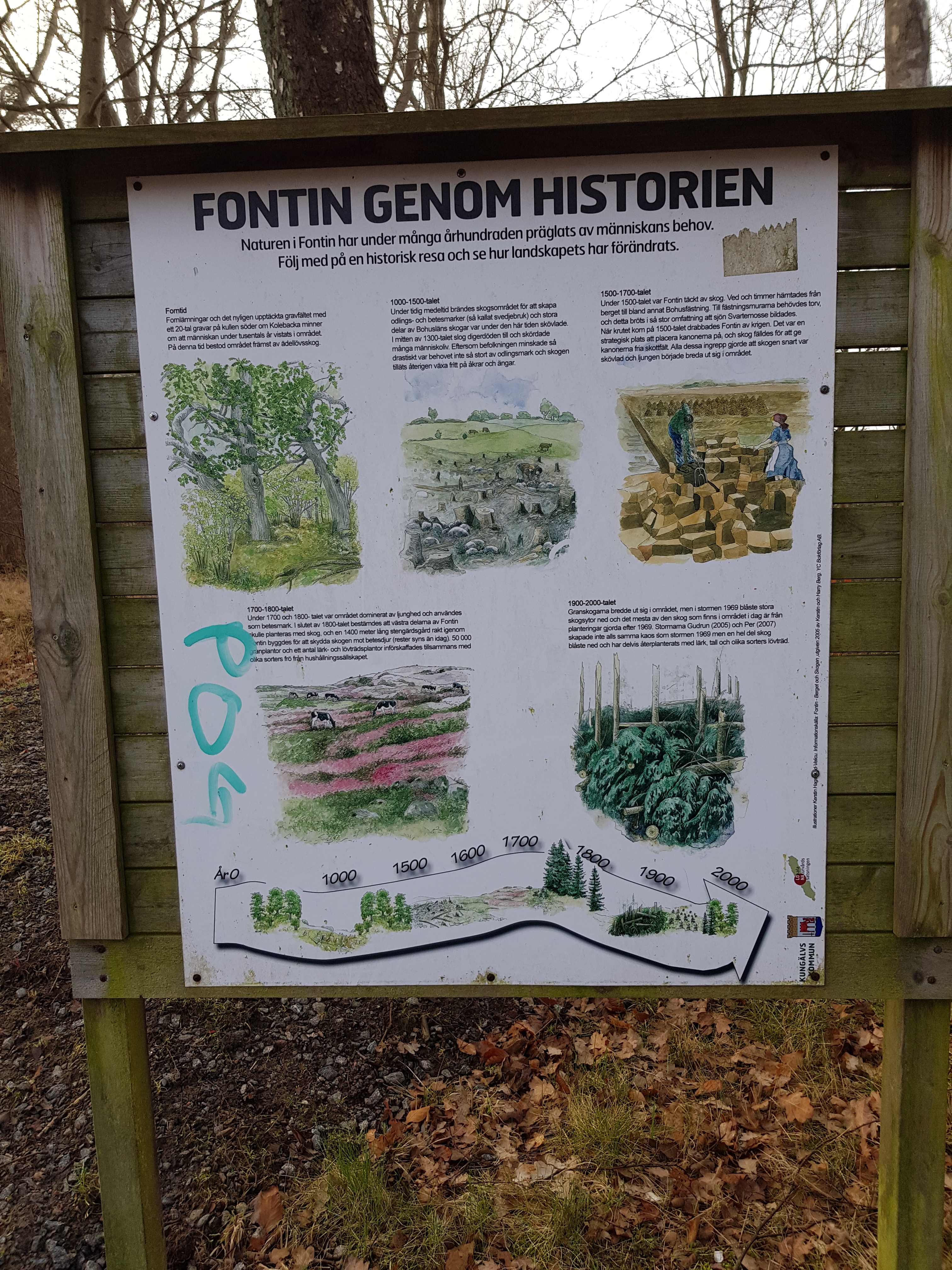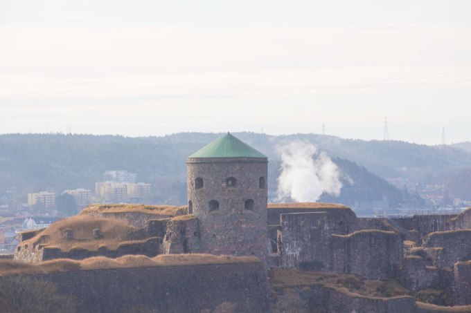 Jag började den korta vandringen i detta historiska landskap med att logga Lämningar från förr #4, Trädkramare, Kärleksstigen – Utsikt och ett försök med att hitta Utsikten, där blev det dock inte någon framgång. Om jag har rätt om placeringen så har burken drabbats av mugglare (men jag kan givetvis ha fel!). Härifrån hade jag tänkt mig att fotografera Bohus fästning, men även den hade blivit mugglad, eller åtminstone utsikten, en tät dimma hade dragit in. Antagligen var det försvararna som vill dölja sig och inte vara med på bild.