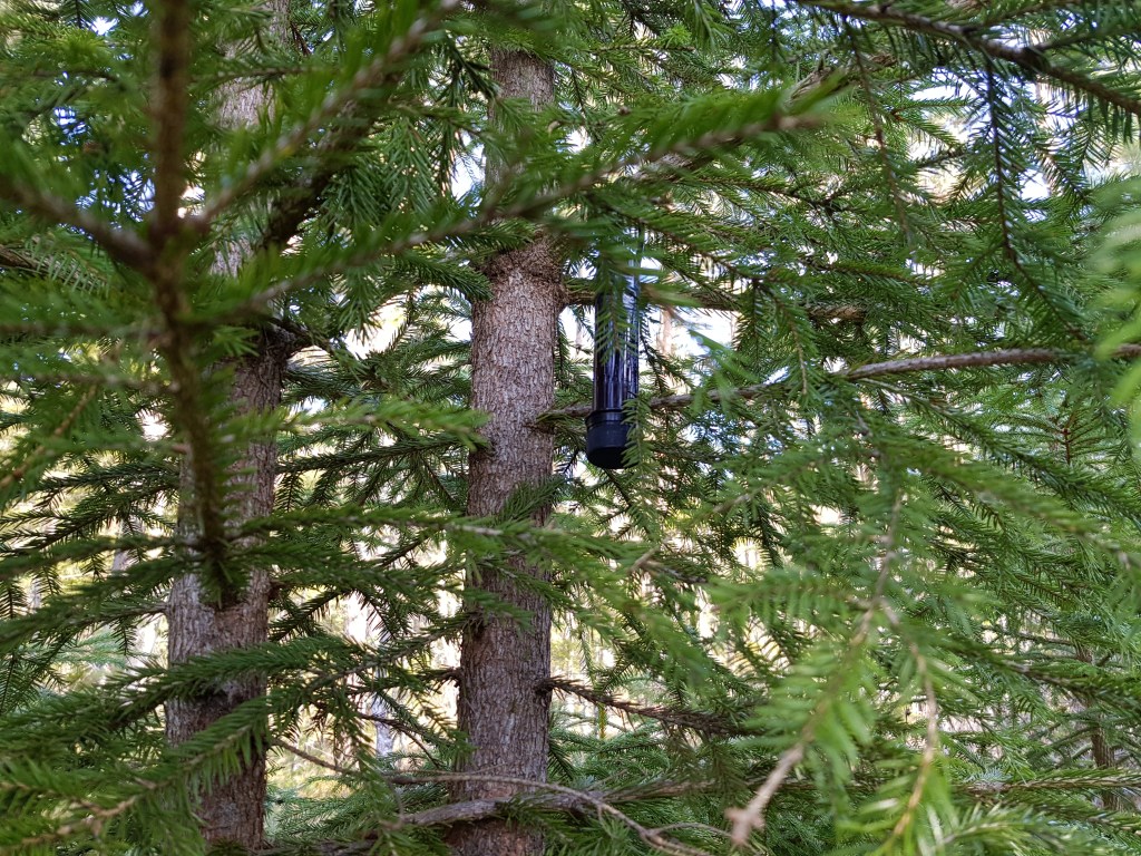 Parkeringskoordinaterna för nästa serie burkar lades in i bilgps:en och knappt 20 minuter senare nådde jag den lilla oansenliga men praktiska parkeringsplatsen där Rulle T på nytt lämnades medan jag drog på vandrarkängorna och gick mot den första cachen, Jul i Lerum 2020 #25 – Upp och hoppa! #1. Det var en slinga på 12 cacher, många med koppling till julträd givetvis, som alla gick snabbt och lätt att hitta.