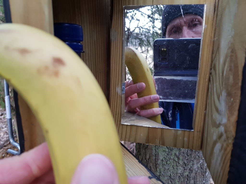 Många av holkarna var speciella och flera favoritpoäng utdelades. En av dessa var Apholken. I cachebeskrivningen skriver CO ”Come and see the monkey!! Här kan du äta din medhavda banan.” Och givetvis plockade jag fram bananen och tittade på apan….