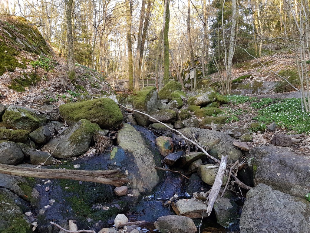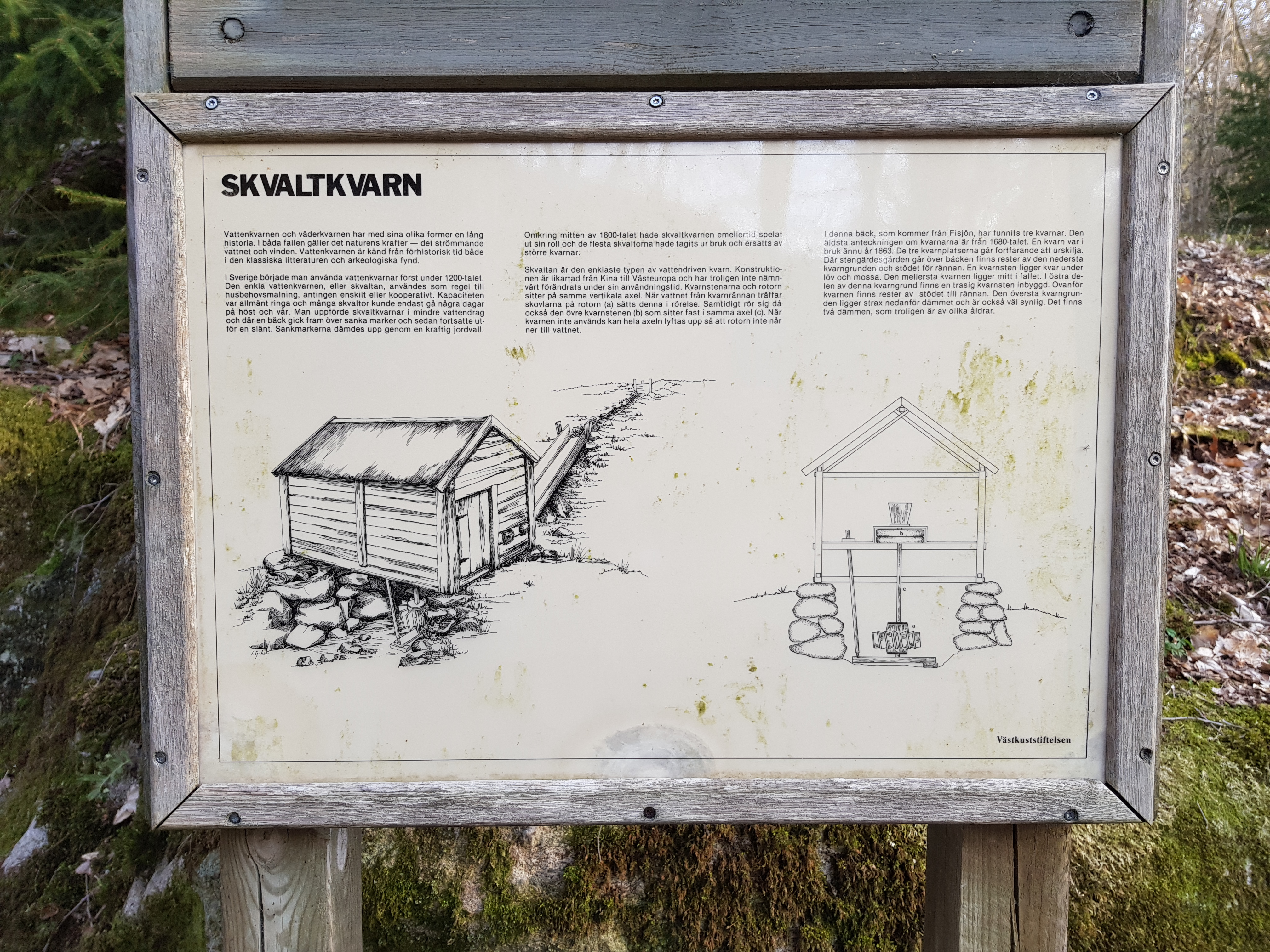 För en stund lämnades nu Årekärrs Röda-rundan och det var dags att åter logga burkar inom Göteborgsserien. #72 blev dagens första och sedan fortsatte loggandet utmed leden bort mot #67. Nära #70 blev jag kvar en stund, inte på grund av att det tog tid att hitta burken utan på grund av att här fanns lämningar av inte mindre än tre kvarnar. Detta lilla kvarnfall har en dokumenterad historia som sträcker sig tillbaka till 1680-talet och kvarnverksamheten bedrevs här ännu 1863.