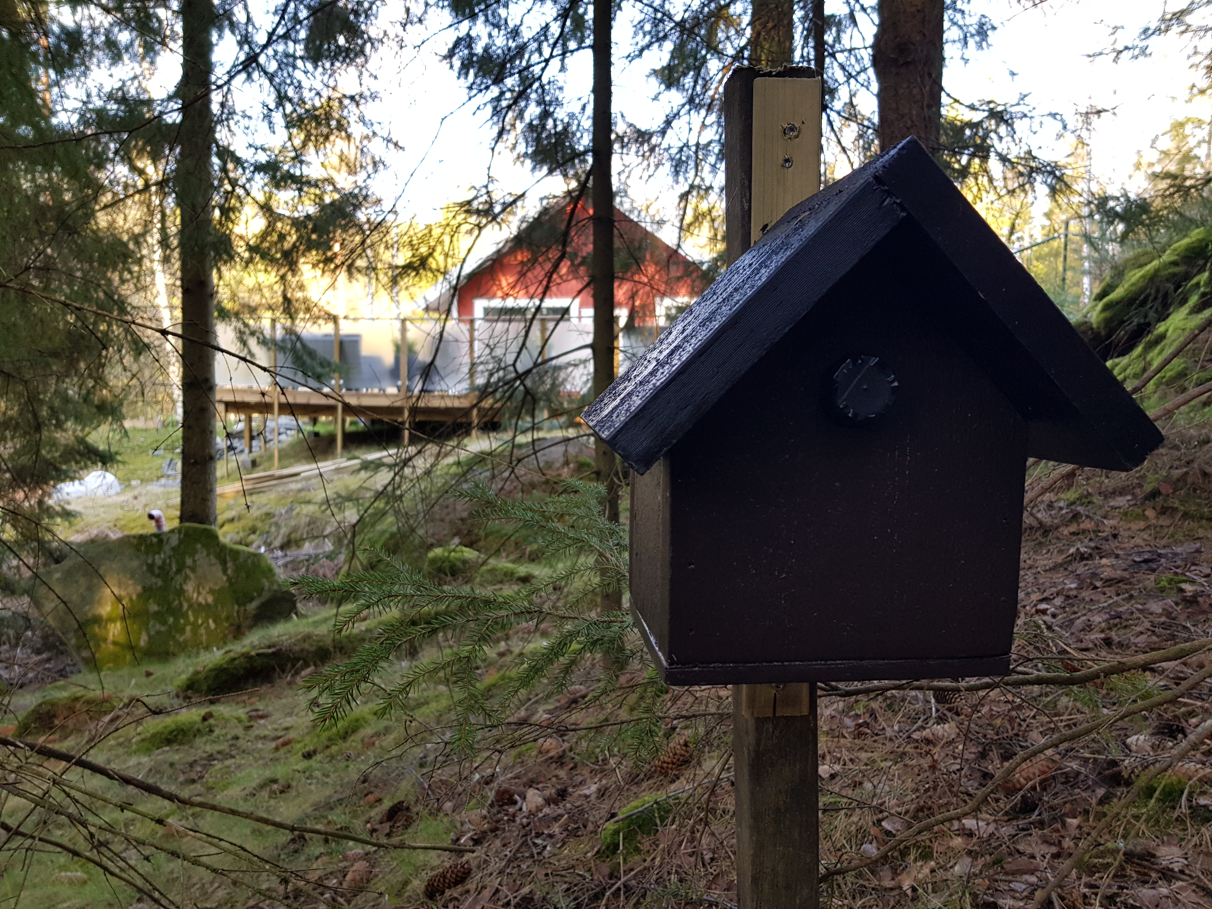 Efter en kortare sträcka utmed gamla Härskogsvägen var det dags att gå in i skogen igen. Tjärn #4 väntade i sjökanten. Tog hjälp av lite naturlig-teknologi och snart var burken fångad. I Lerum finns inte bara julkalender-cacher, det finns även Inför julkalendern i Lerum 2020. Det sägs bo en nisse under stenen, men han var inte hemma i dag. Mindre framgångsrikt var besöket vid Tjärn #2, den satt för högt för att jag skulle ge mig på klättring, så den fick lämnas.
