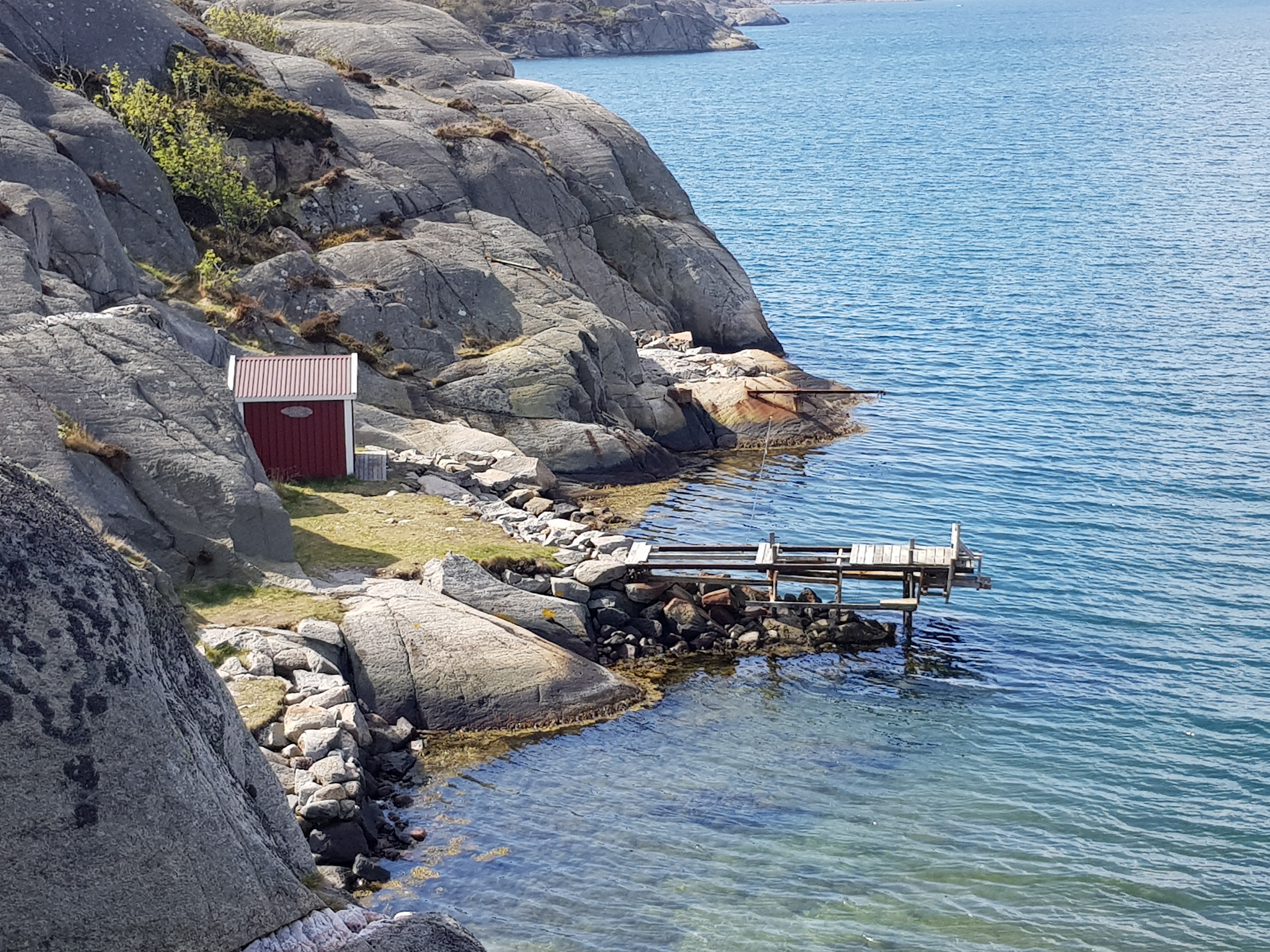 När denna burk klarats av gick färden tillbaka över klipporna för att fortsätta på Göteborgsseriens gömmor. Ytterligare en avstickare över klipplandskapet gjordes för att logga Amundön Sydost. Det blev en tur i stiglöst land över klippor, hål och enbuskar. Den södra sidan har inte (lyckligtvis) någon bred grusväg, istället kan det se ut som på bilden nedan, en spång som svävar en bit ovanför vattnet.