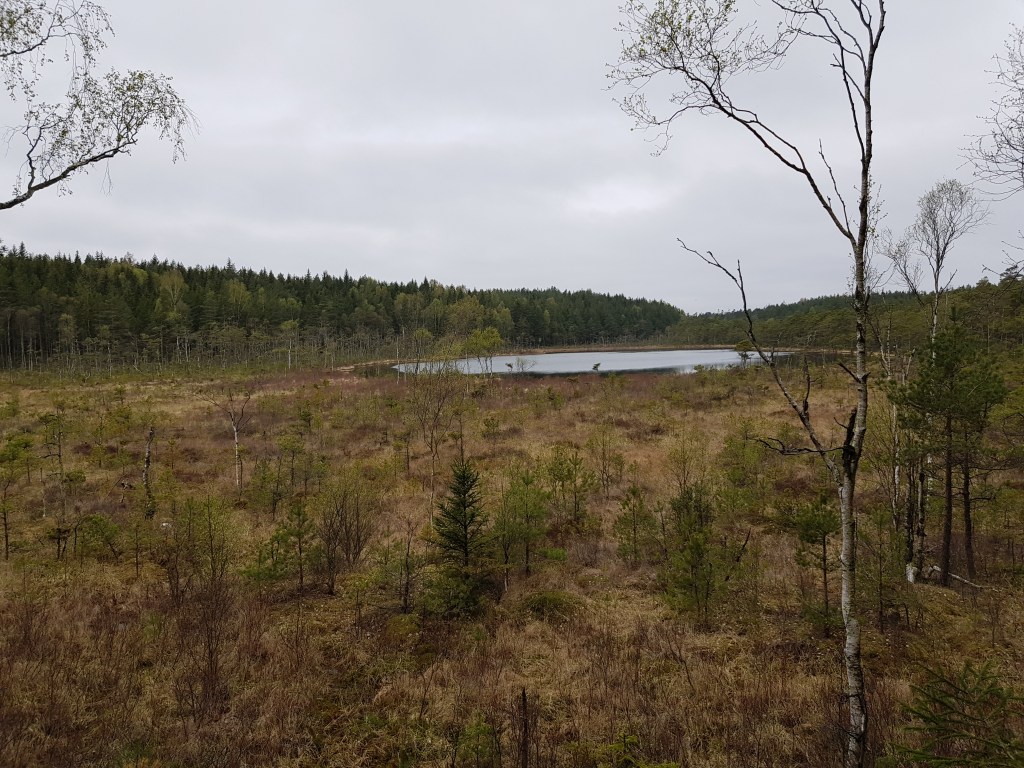 Vid #9 på S-rundan var det en fin utsikt över en mosse och en tjärn. Där blev det lite geo-fika och naturen bjöd på extra underhållning i form av trumpetande från traktens tranor.