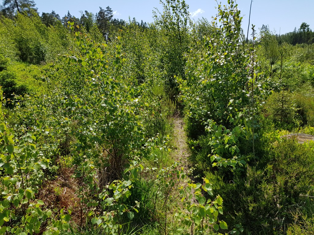 Oftast brukar vandringsleder hållas öppna av att folk rör sig där, men på ett av de hyggen som passerades hade sly vuxit upp nära inpå leden, det var knappt att det gick att se var man satte fötterna.