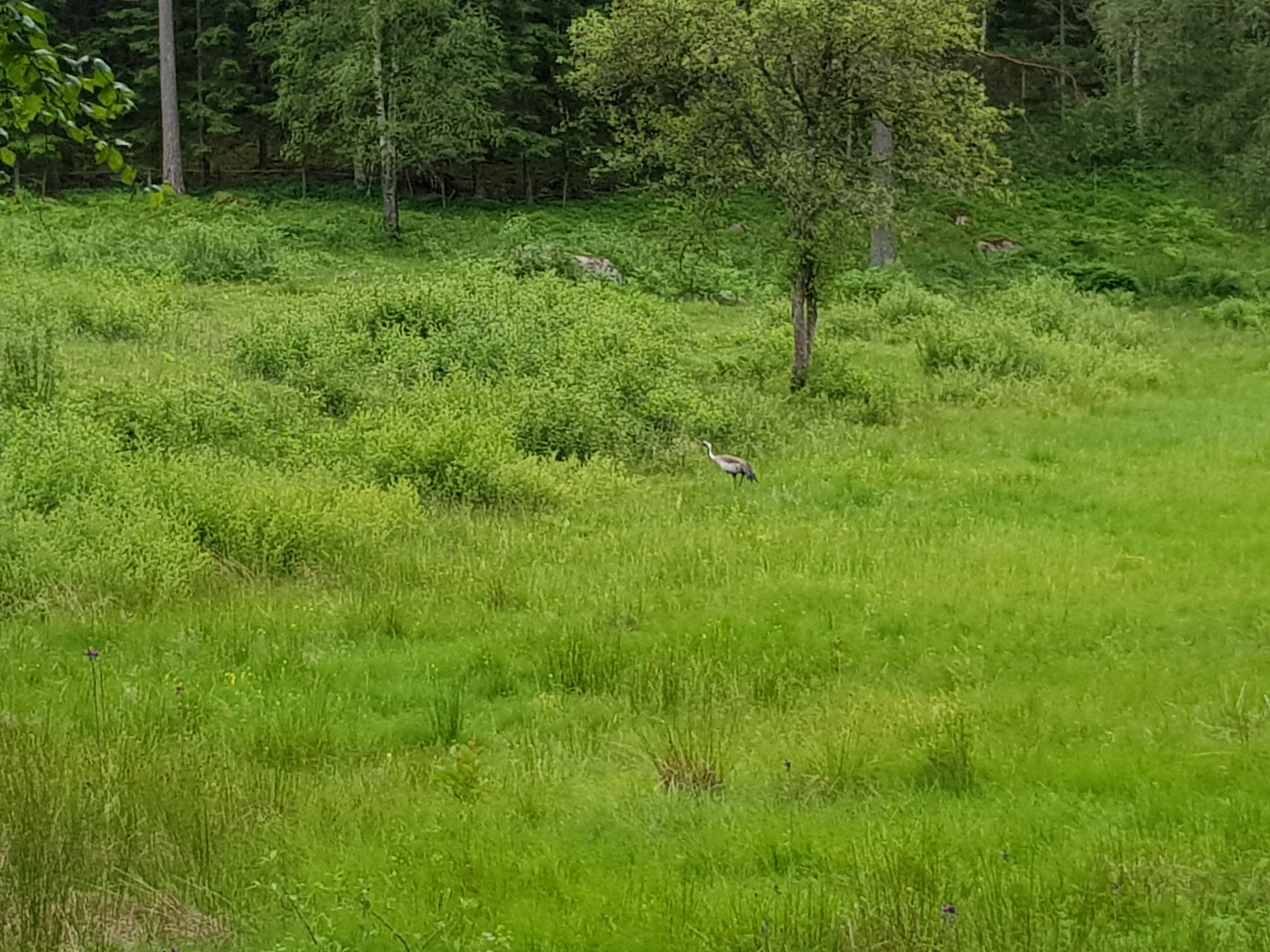 Sedan dök det upp en trana, trots att jag var långt från Tranemo! Dessutom var fågeln ovanligt orädd och den nästan följde efter mig ett stycke.