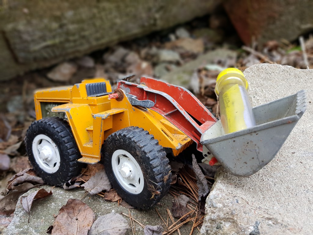 Dagens sista cache blev The end of the road, som hade passande inramning för sin placering vid grustaget. Efter framgångsrik loggning gick vandringen tillbaka mot hembygdsgårdens parkering där Rulle T tålmodigt väntat.