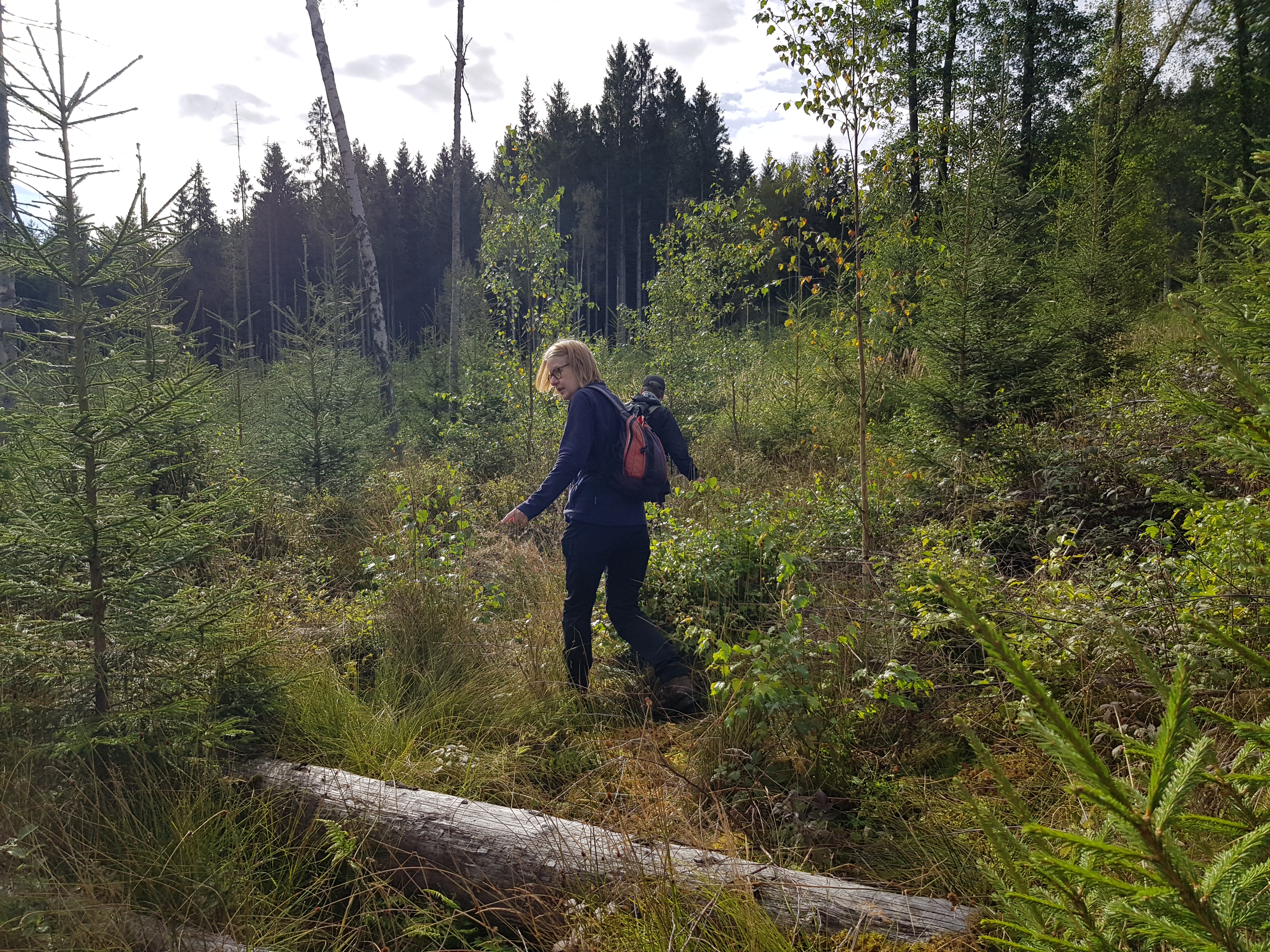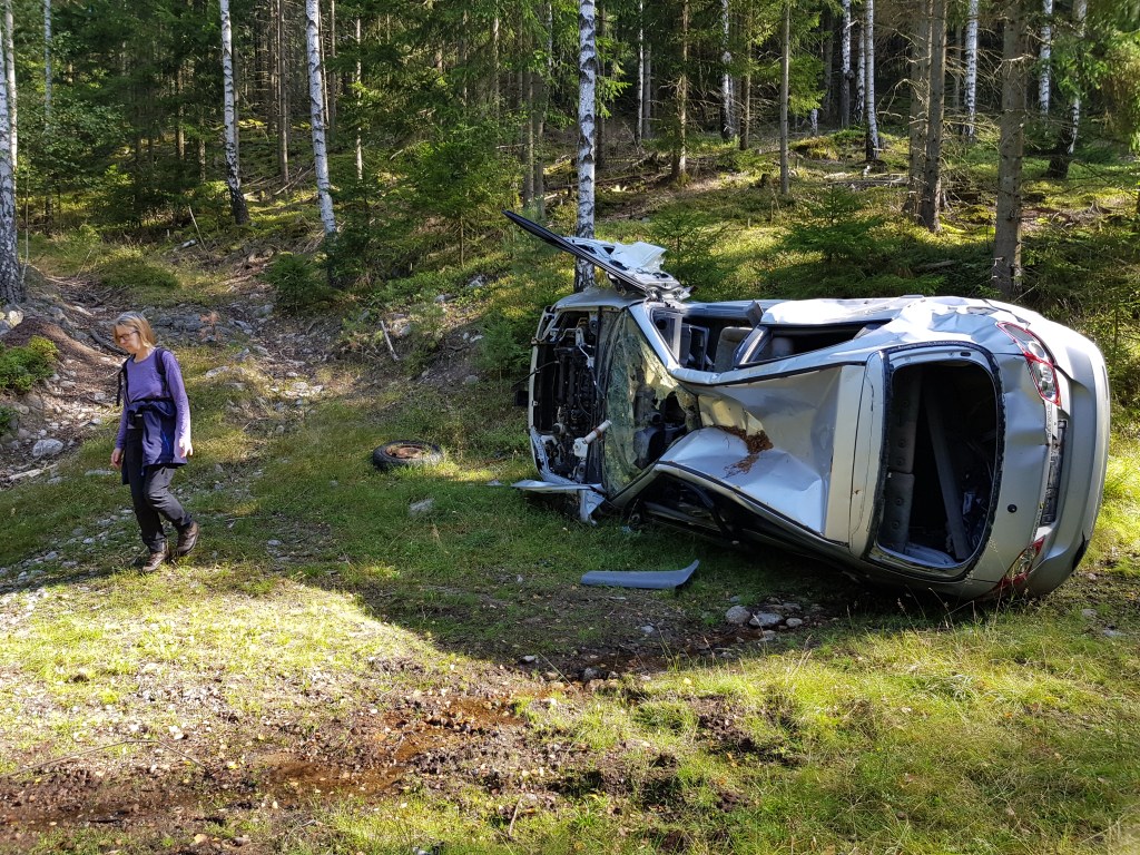 Vi fortsatte genom skogen utan hjälp av stigar, över diken och upp på höjder. Men så plötsligt närmade vi oss väg igen, och där låg ett fordon med renoveringsbehov.