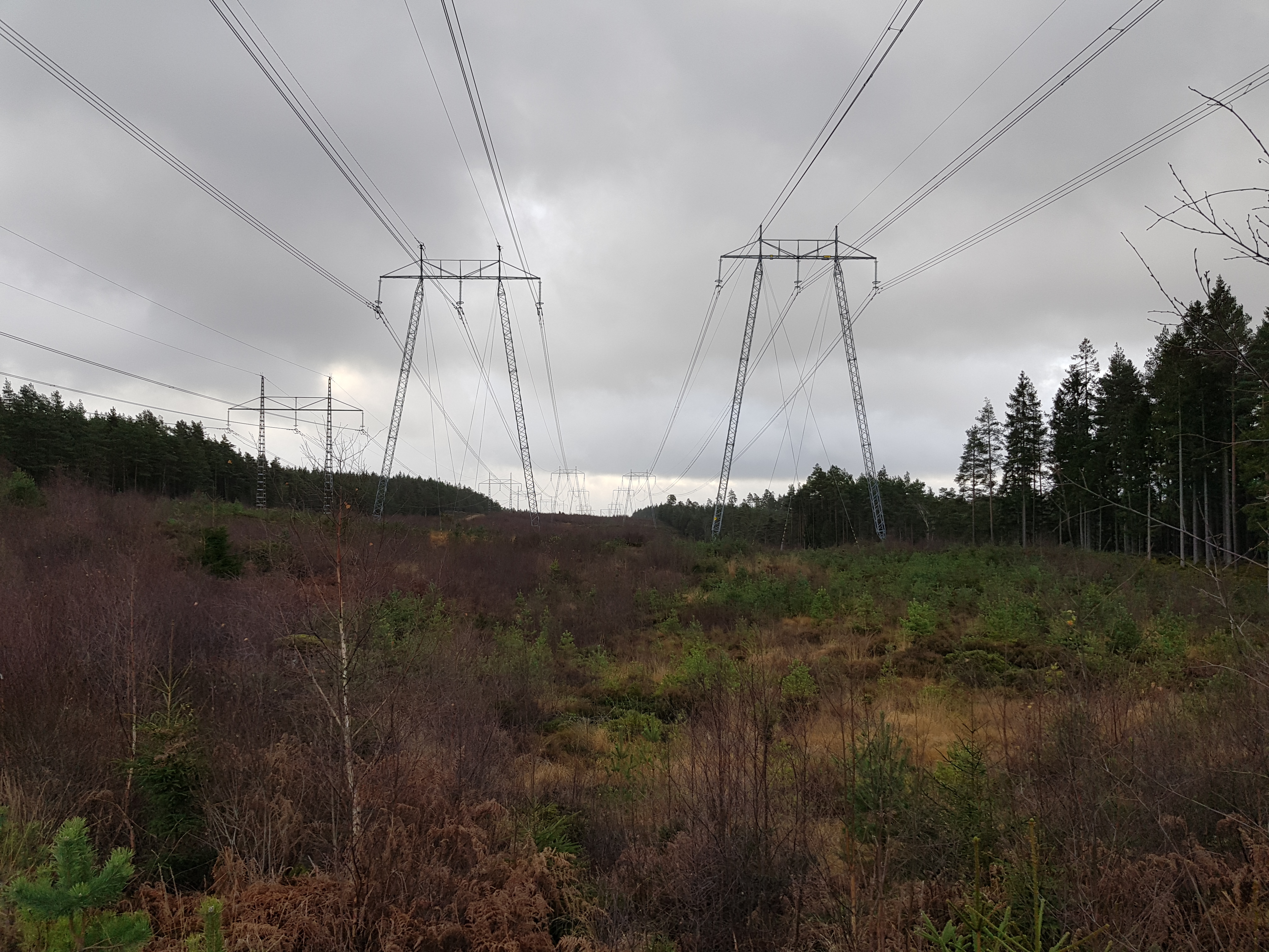 Jag avvek nu från Floda-Härskogen leden och följde en liten grusväg under den stora kraftledningen. Vid en en, av det större slaget stiftade jag bekantskap med cachen Thirst to find. Det började nu droppa ganska oroväckande många vattendroppar från molnen ovan. Den hade kommit lite skurar tidigare, men nu började det bli mer intensivt.
