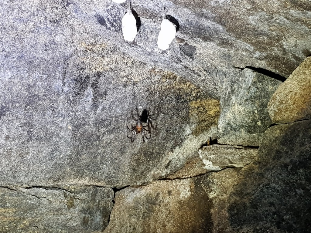 Den lätthittade cachen var snabbt signerad så jag fick inte lov att sällskapa med spindlarna i närområdet speciellt länge innan det var dags att krypa ut och åter känna regnet piska i ansiktet. Vandringen gick nu mot nästa Ingabo & Heimdall cache, båda var utlagda till FAD eventet som hölls i trakten 2011. Pyramids and rhomboids var ett passande namn på platsen, burken kunde dessutom snabbt och lätt hittas. Men därefter skulle turen inte längre vara med mig.