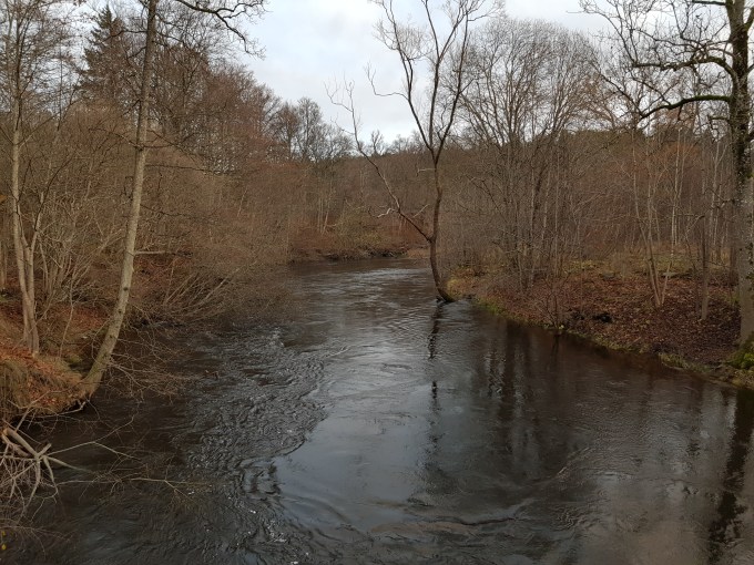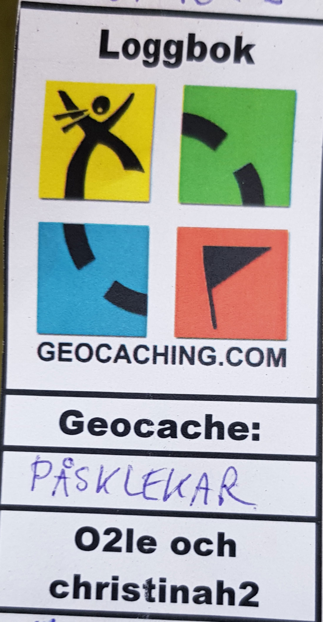 Efter matning och tvätt av Rulle T gick färden österut ett kort stycke till Jonsered denna söndag. Strax före kl. 8 hittades en gratis parkeringsplats och dagens vandring i Jonsereds skogar kunde inledas. Först gick jag dock mot Säveån för att leta upp en påskburk, 4. Påsklekar. Pip 2018. Efter mycket letande högt och lågt fick jag se en pappersremsa liggande på marken och nog var det loggremsan alltid, men burken syntes inte till.