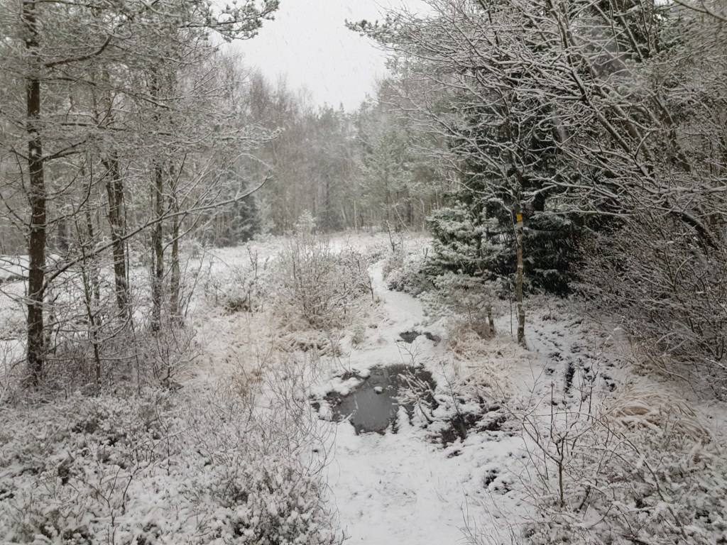 Den gröna skogen hade nu blivit vit! Tunn is som täckte en del mindre vattensamlingar var nu osynlig och det gällde att inte trampa ned i några vattenfyllda hålor. Transportsträckan tillbaka mot parkeringen gick dock utan några problem och snart var jag åter vid Rulle T som var täckt av snö. Det krävdes lite rengöring innan avfärd. Vinterdäcken som Rulle T fått förra fredagen kom nu till god användning på det vita underlaget.