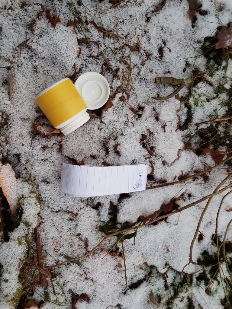 Men kylan gjorde att pennan inte ville skriva speciellt tydligt, loggen fick därför kompletteras med en foto-logg. Hade jag varit ute på en ”riktig” runda hade geo-ryggsäcken varit med och då hade alternativa pennor funnits att tillgå, men så var det inte på dagens tur.