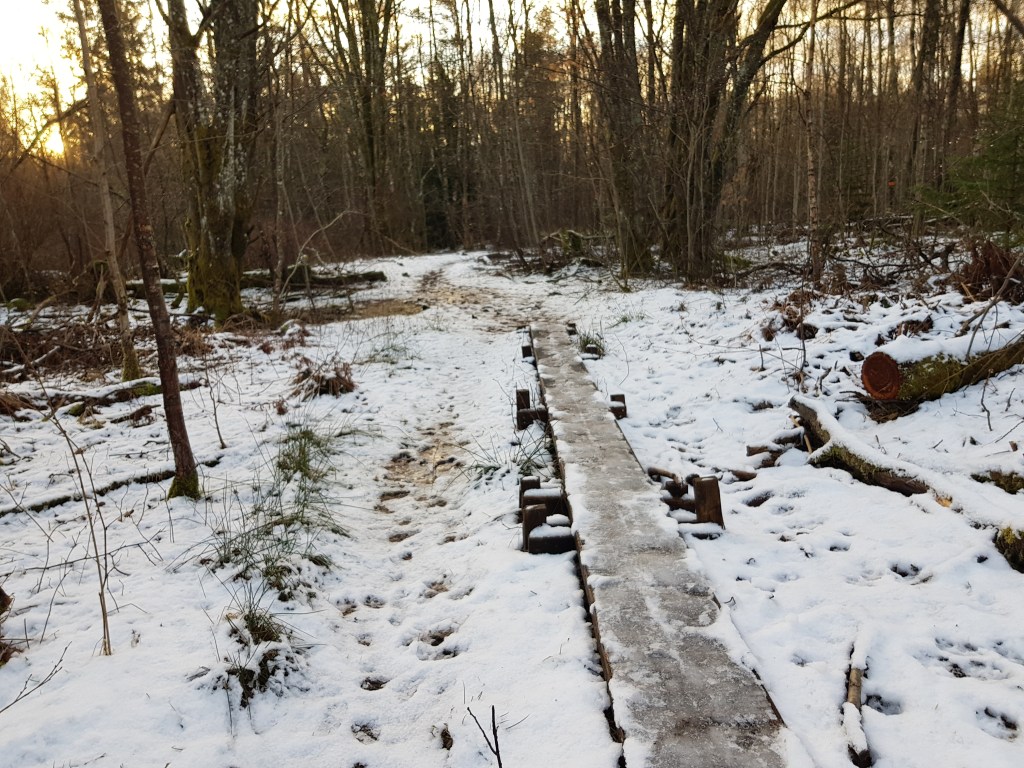 Trots att spängerna såg ut som isgator gick det att ta sig över ett flertal, antingen genom långsam gång eller helt enkelt att välja alternativ väg. Men så nådde jag en plats där ett mycket blött område skulle passeras och spången över den var helt istäckt, inte minsta fäste fanns att få. Dessvärre hade jag ”vanliga” kängor och inte icebuggs så jag fick överväga valmöjligheterna. Att försöka ta sig över och med hög sannolikhet få ett ovälkommet vinterbad, eller vända om. Jag valde det senare!