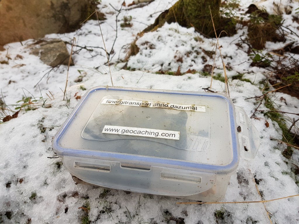 På något halkiga vägar rullade Hallén med Rulle T upp mot den stora skogen på Alefjället, granne med Vättlefjället. Tanken var att utnyttja det soliga, men något kyliga, vädret för en liten vandring. Efter parkering vid Jennylunds idrottsområde gick vandringen mot Bohusleden. Det var nödvändigt att gå i terrängen utanför bilvägen för att få fäste! Även leden var täckt med snö, is, vatten och lera om vart annat så det var mer vandring i stiglös terräng än på leden. Men ganska snart skulle jag ändå vika av ut i skogen och vidare över en mosse. Här fanns mycket tydliga tecken på vildsvinsaktivitet, och dessutom färska spår av dessa djur. Efter lite älgklivande genom markerna nådde jag fram till en smått historisk plats i området och cachen Energitransport anno dazumal, som i sig också har en historia då den placerades ut 2009.