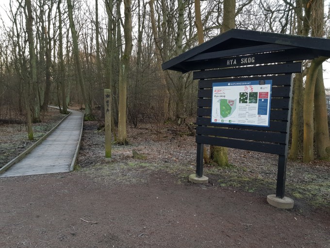 Efter gårdagens långtur blev det en kortare tur denna söndagsförmiddag. Målet var att dels logga tre cacher i Rya skog, dels förse mitt digitala fotoalbum med en del motiv från denna märkliga lilla skogslämning inklämd mellan industri- och reningsverk. Det var behagligt fritt från trafik när jag med Rulle T tog mig väster ut över Hisingen. Snart ankom vi till en helt tom parkering och sökandet efter dagens första burk, Entrén till Rya Skog, tog sin början. Inledningsvis fokuserade jag på fel objekt, men ganska snart visade gps:en allt mer tydligt på ett annat objekt och där hittades efter en stunds letande även burken.