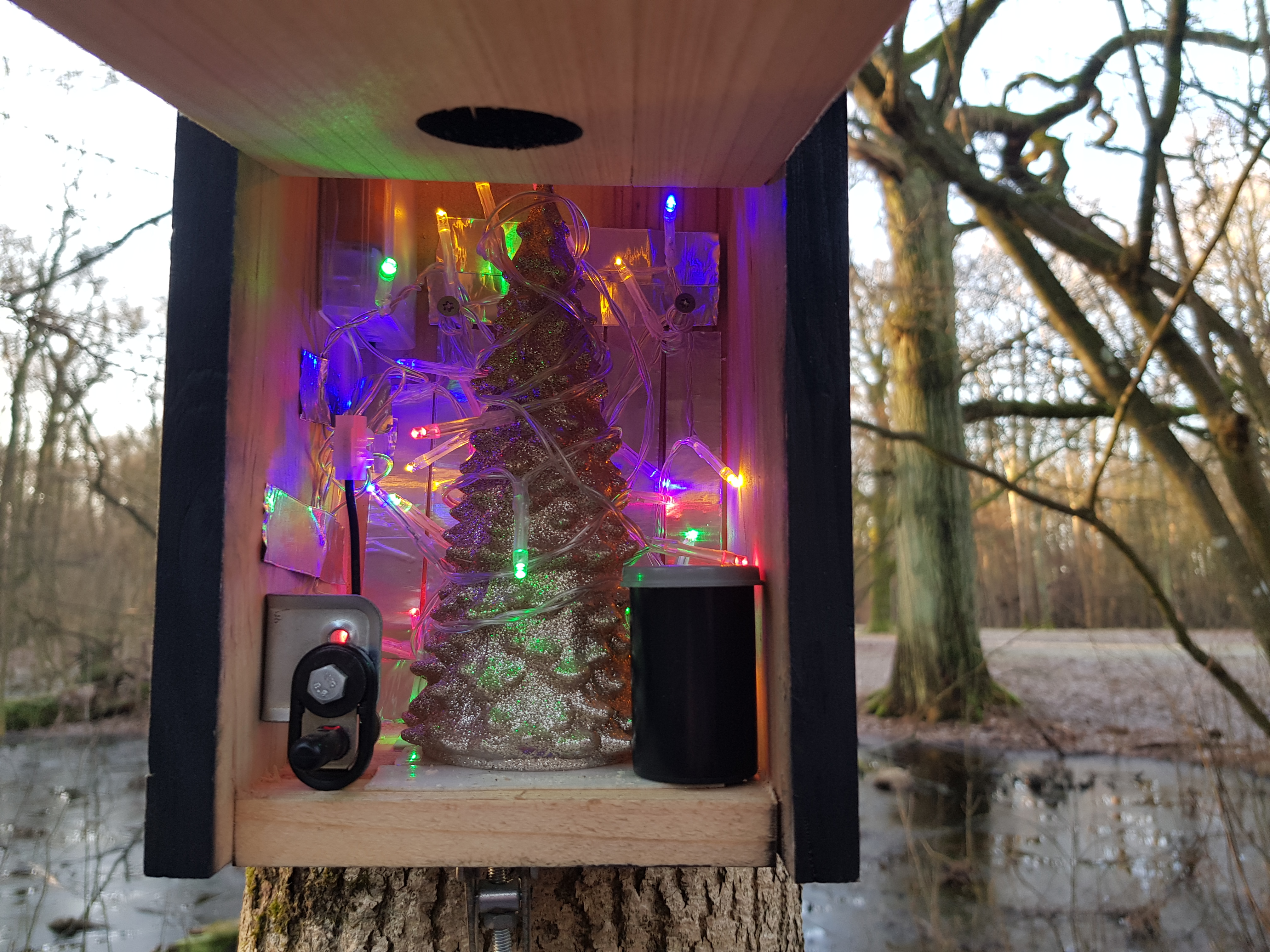 Dagens tredje cache, Göteborgs Julkalender 2021 #1 Rya Skog, var lätt att hitta och i mycket gott skick. Juldekorationerna fungerade fortfarande utmärkt dessutom! Därmed var dagens burkjakt avslutad och det var tid att återvända hem mot cachingbasen.