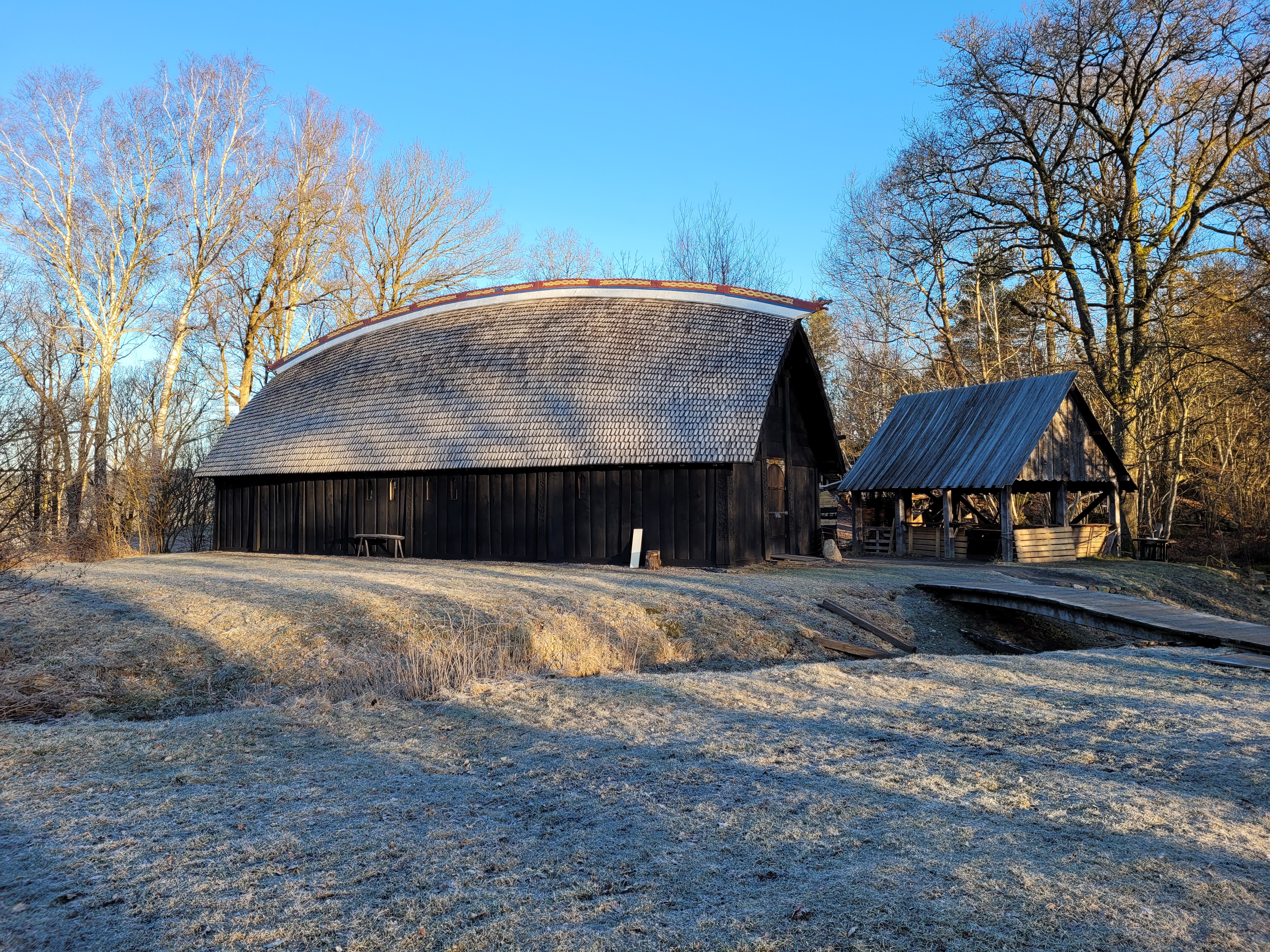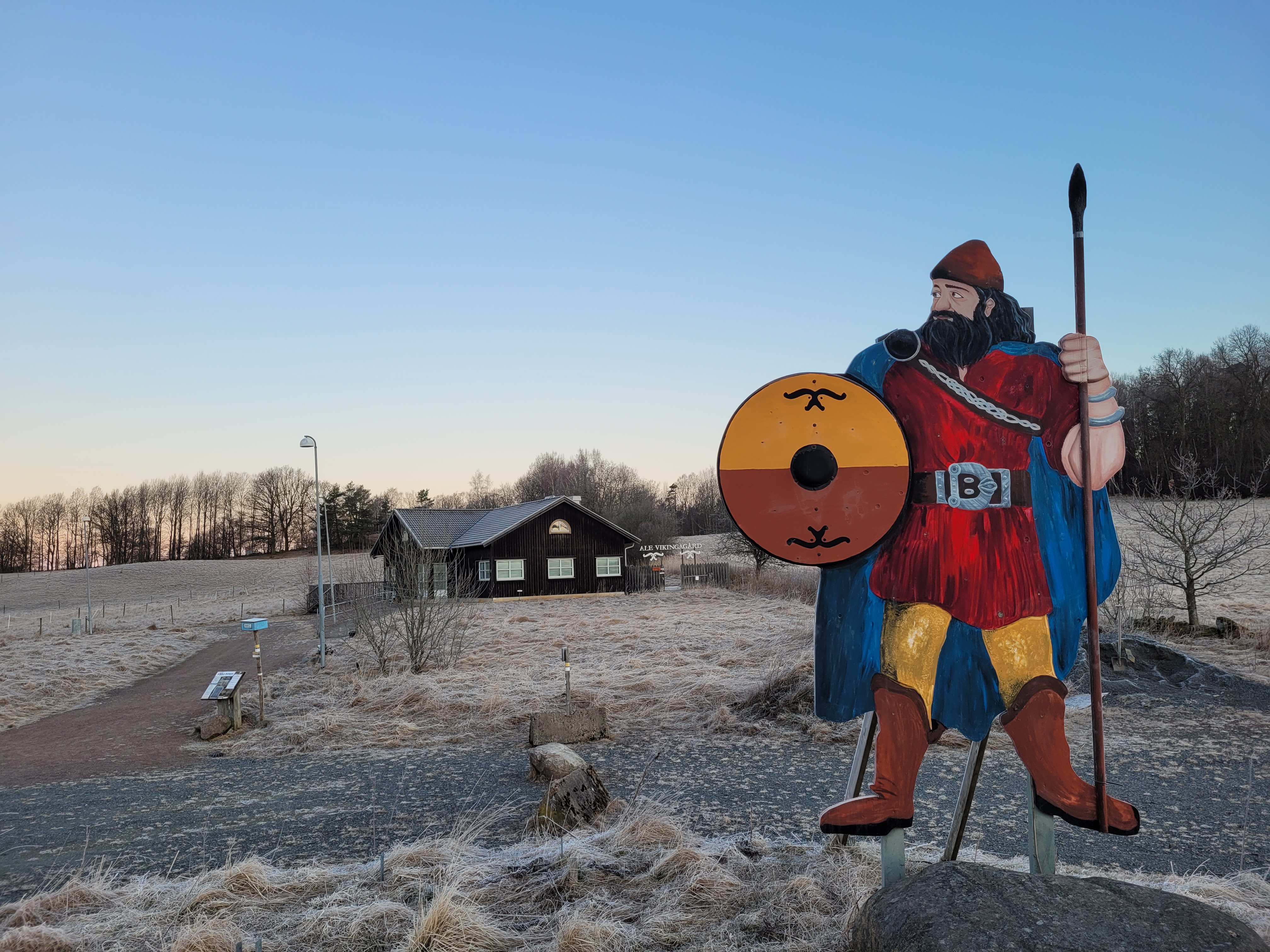 Strax efter gryningen rullade Rulle T och Hallén in på parkeringen vid Ale vikingagård för att ta i tu med en liten runda burkar. Redan vid infarten väntade en viking, han såg ganska beskedlig ut, men skenet kan som bekant bedra. Lyckligtvis var han vänligt inställd till geocachare och jag fick säkrat dagens första logg.