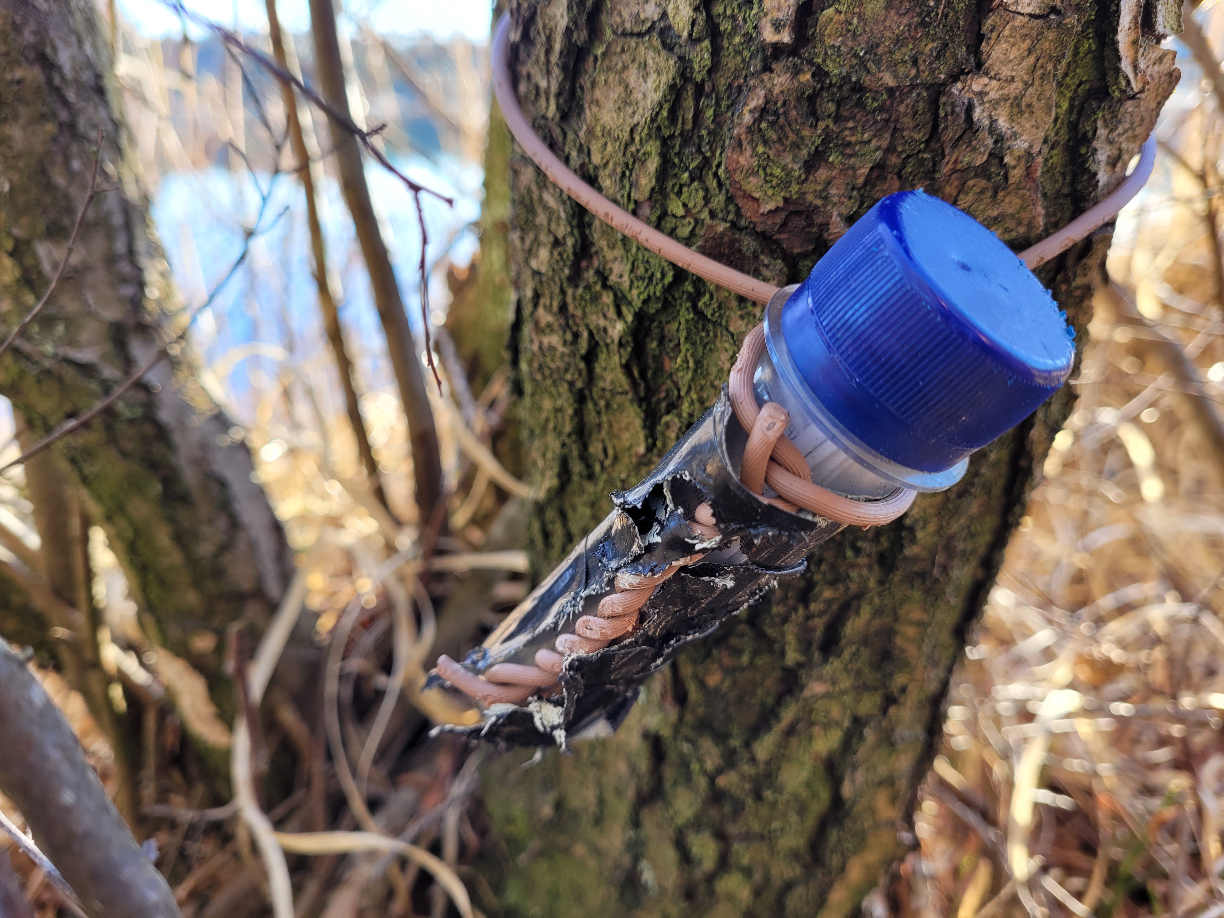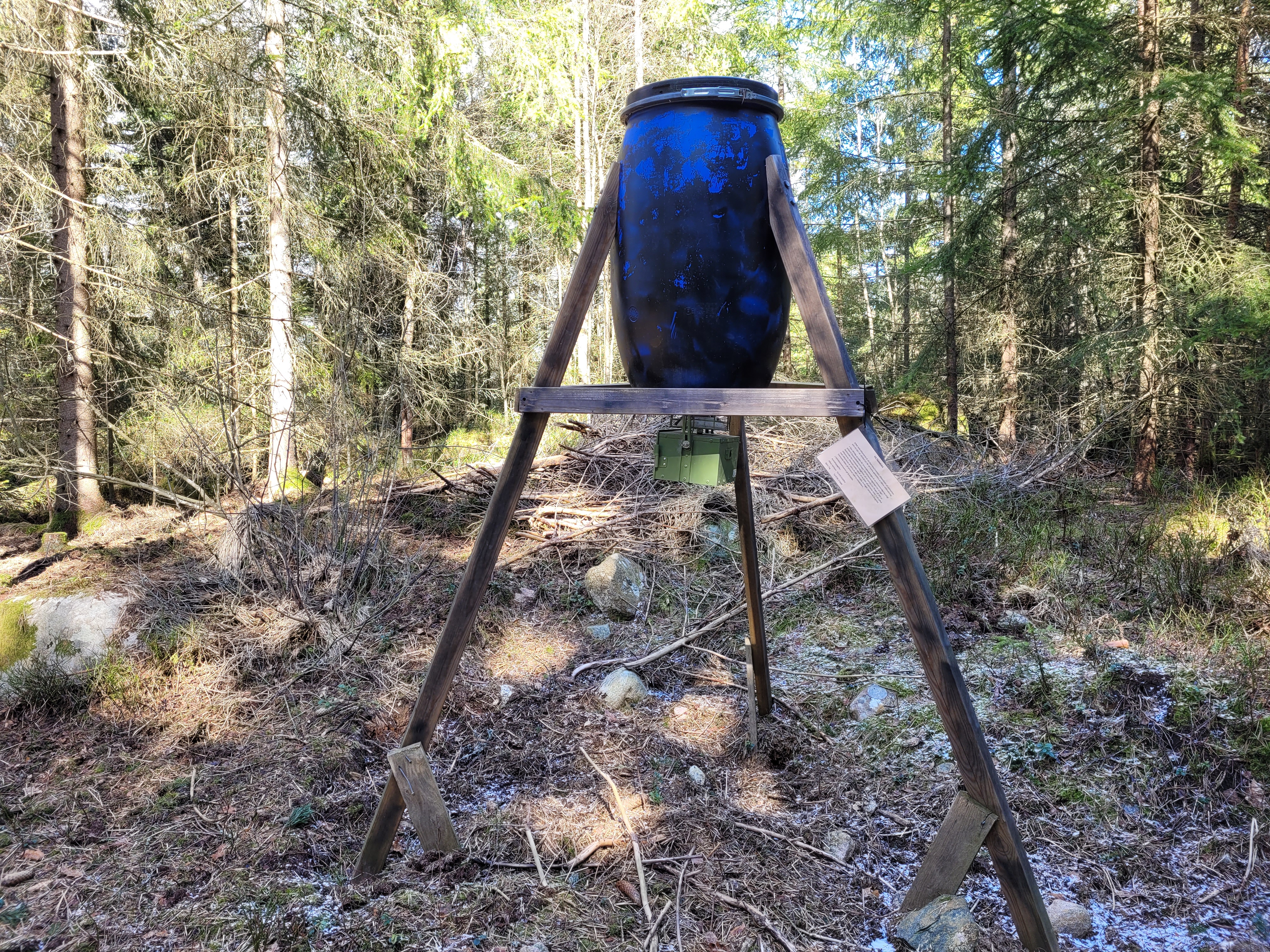 Det var inte många djur aktiva i skogen i dag. Men det var uppenbart att det finns gott om bökande vildsvin i denna trakt. Kanske blir några avbildade på den viltkamera som jag passerade – och fotograferade (se längst ned till höger i mosaikbilden nedan) Kameran satt under utfodringstunnan. Ett par kanadagäss på sjön tittade på vid en loggning, och gav livliga kommentarer. Vet inte vad det hela handlade om, men det lät aningen gnälligt!