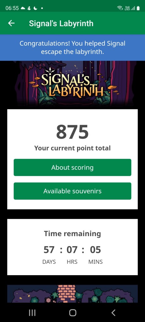 När jag är ute på burkjakt används en gps av traditionellt slag men i bland startar jag även appen på telefonen. När jag gjorde så i dag dök det upp besked om nya souvenirer, tydligen hade jag, utan att närmare planera saken, lyckats hjälpa allas vår signalgroda ut ur en labyrint. Det glädjer mig givetvis, men jag hade inte planerat detta hjältedåd!