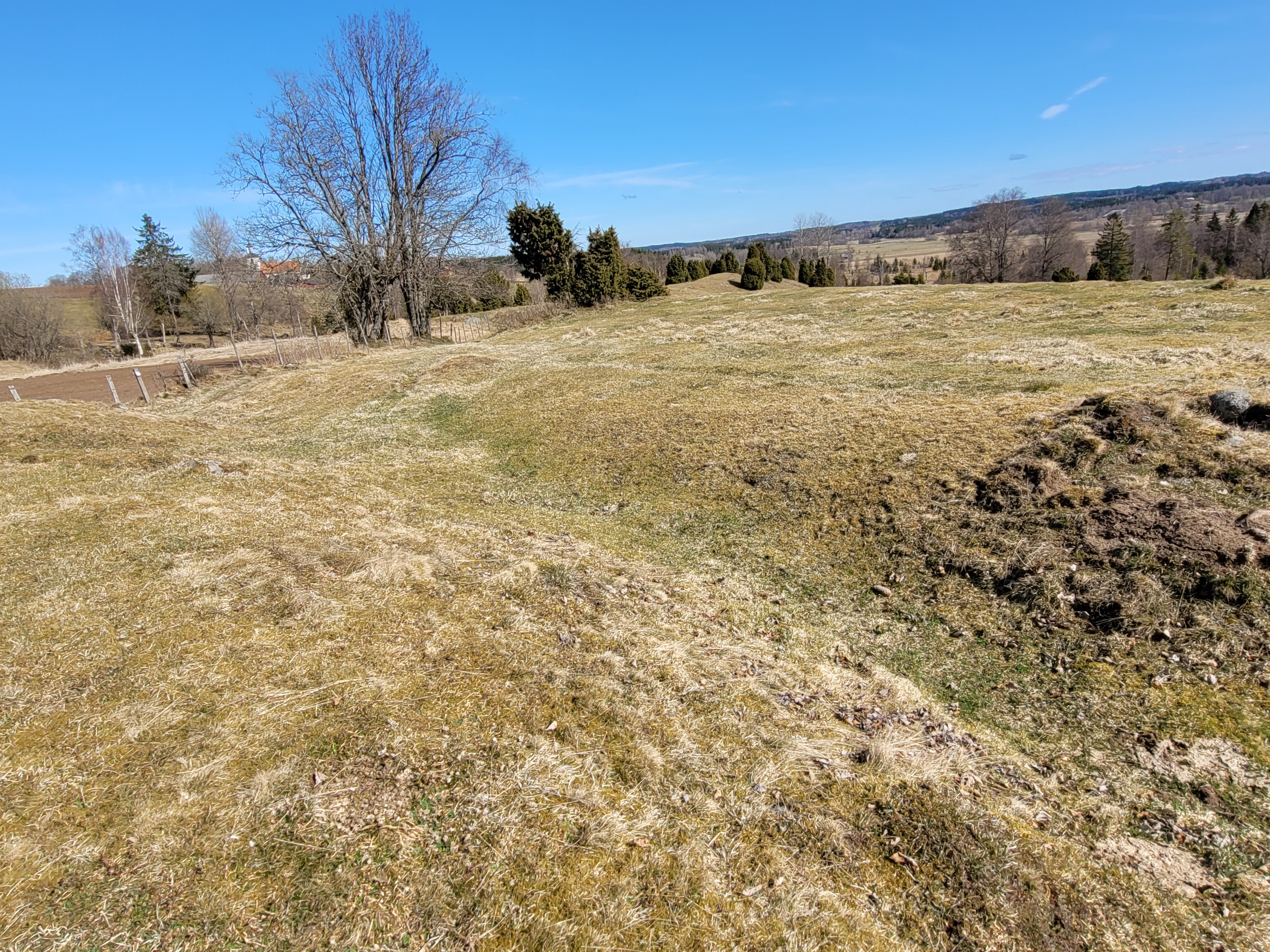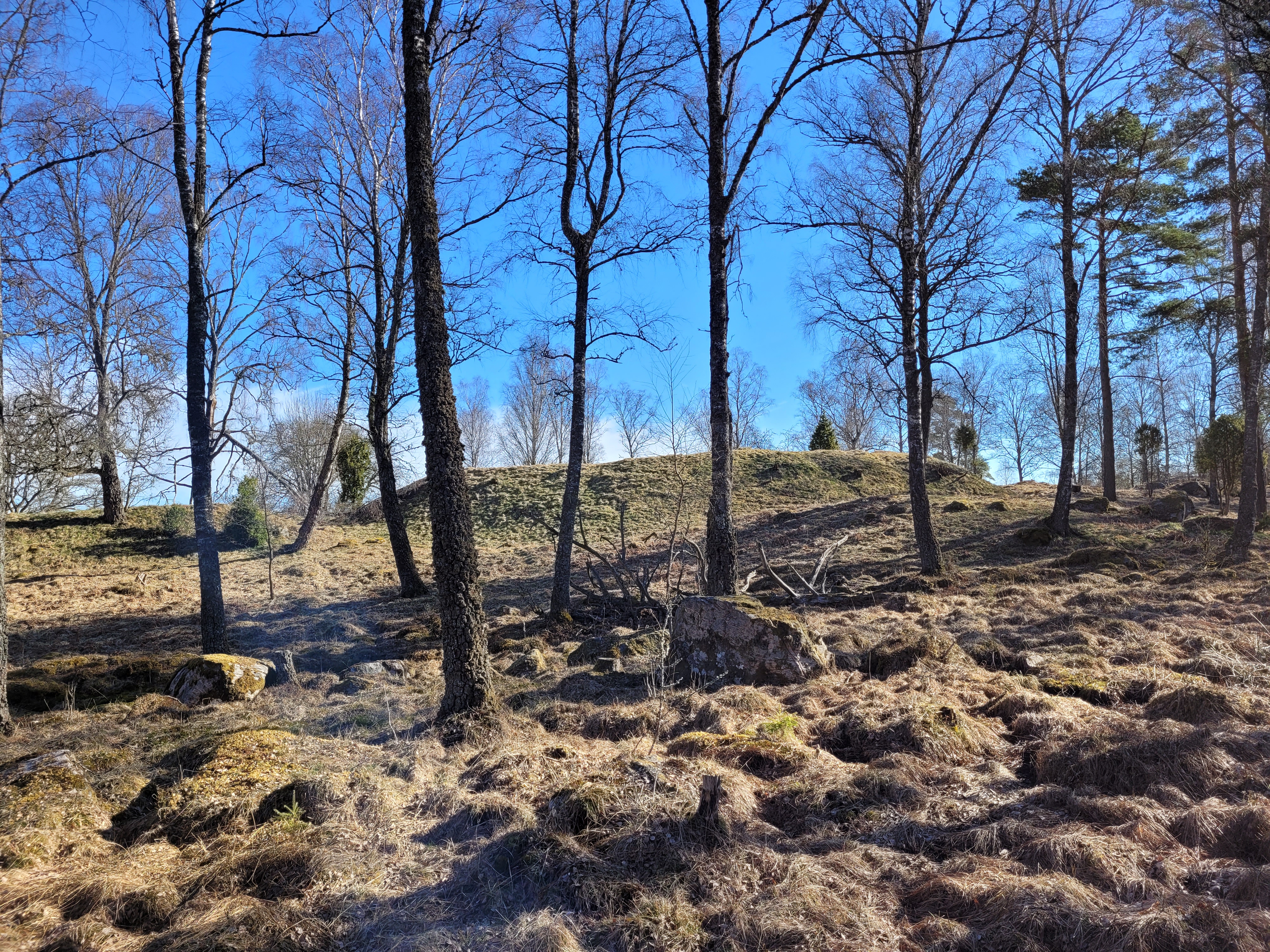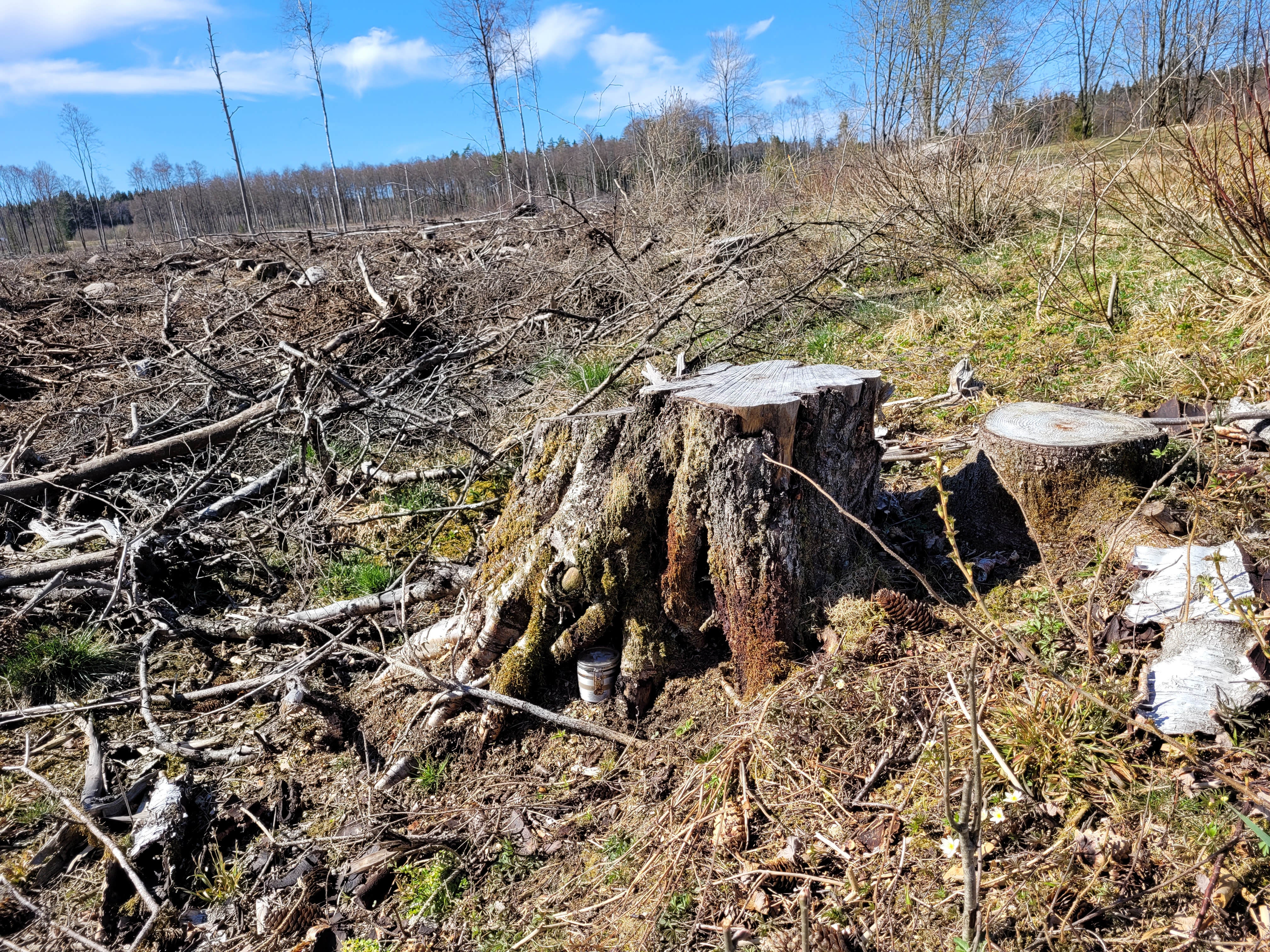 Alla stegen klarades av och även bonusen hittades. Därefter gick jag jag ut på en extratur för att leta upp lite traditionella burkar i omgivningen. Naturreservat och fornåkrar Hössna Prästgård hittades lätt på väg ut från naturområdet. När jag närmade mig Hössna IF såg jag att skogsmaskinen varit framme, det såg bedrövligt ut! Kan en burk överleva denna trädmasaker? Senaste besökare som var här under vintern hade inte hittat burken utan endast resterna av björkarna. Men vid mitt besök var det snöfritt och jag såg snart stubben av en dubbelbjörk och vid dess fot fanns en burk!