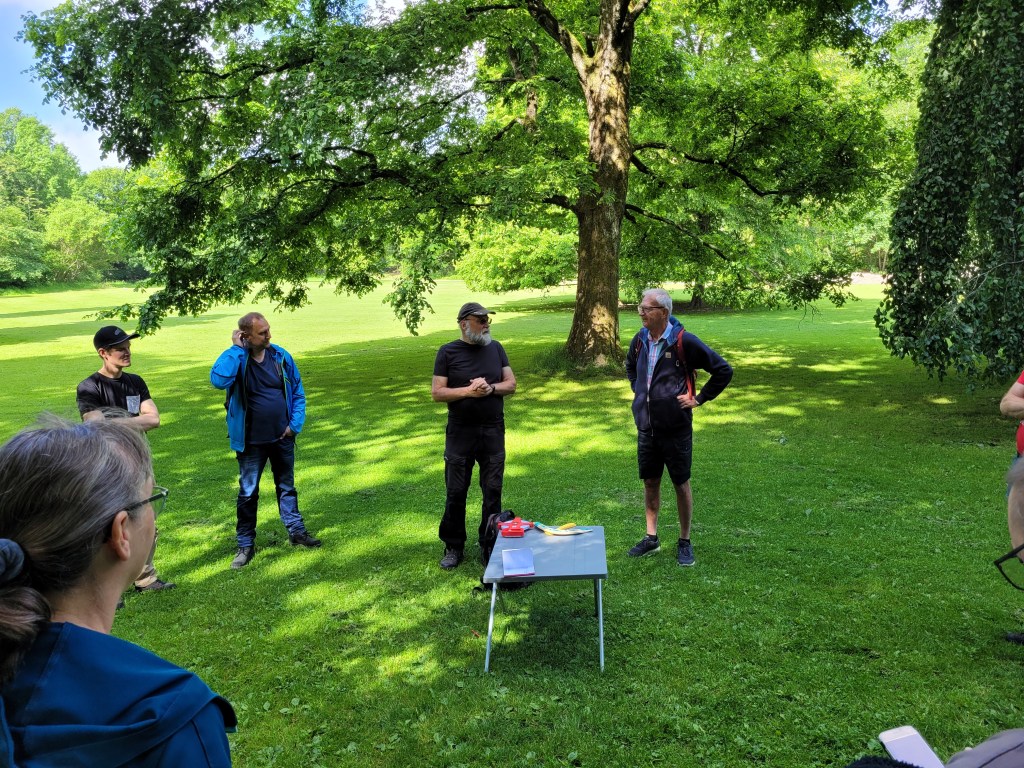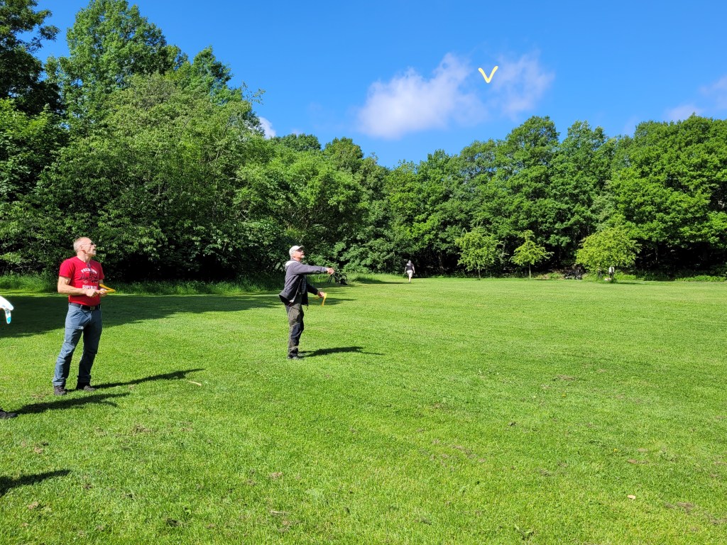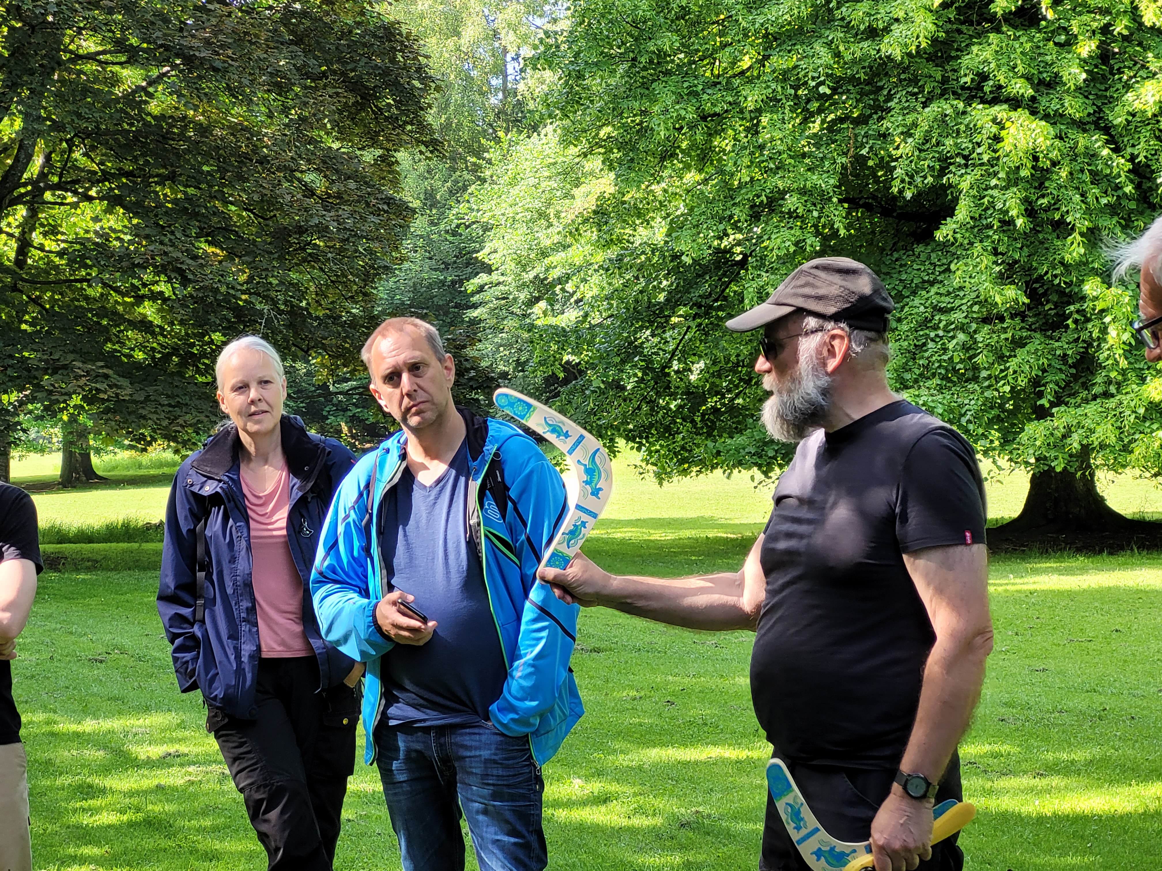 En bit framför mig såg jag EO skynda mot koordinaterna med bord under armen, det var bäst att haka på och skynda sig så man inte missade något! Inledningsvis var vi en liten skara, men den växte ganska snabbt och vi fick veta något om eventets olika aktiviteter, digital poängpromenad (26 frågor) och bumerangkastning. Det fanns många mål att sikta på i parken, en grupp dansare med trummor, mammor med barnvagnar, gräsänder, hundar och geocachare som gick poängpromenad, men alla undkom olyckligtvis och det blev därmed inget att grilla denna kväll! Närmast att träffas var nog en fiskmås som var ytterst irriterad över bumerangflygningen. Men fiskmåsen avlägsnade sig när den fått en del stryk av en trast som bodde i ett av träden. Den ville inte ha en mås i närområdet, av förklarliga skäl.