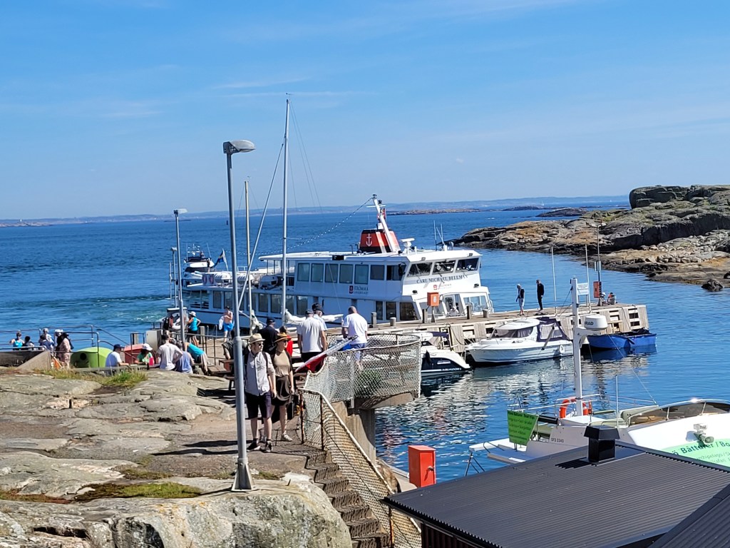 Dagens sista cache blev åter en Earth cache, Vinga Fyr [porfyrit] – Earthcache. Den krävde något mer funderande och studerande av den mycket speciella sten som fyren är byggd av, och som även ön till större delen består av. Men vi löste med gemensamma krafter problemet. Ingabo rusade därefter iväg som en bergsget över klipporna mot två andra närliggande cacher som jag och jsson loggat tidigare, vi tog istället fram matsäcken och kunde njuta av vädret en stund i väntan på att vi åter skulle gå ned mot hamnen för att återvända till stadens brus. Mycket nöjda klev vi av båten vid Lilla Bommen för hemfärd efter en fantastisk liten cachingutflykt.