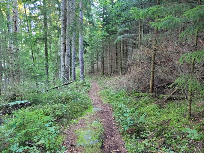 Vandringen gick genom en trevlig skog på både små skogsvägar och, bäst av allt, skogsstigar. Några av cacherna fick jag leta efter ganska länge då gps:en inte riktigt kunde besluta sig för var nollpunkten var. Men genom systematiskt sökande kunde burk efter burk klaras av.