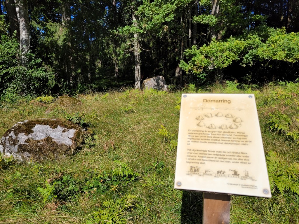 Utmed den sista sträckan av vandringen passade jag på att titta på traktens domarring som visar att här levde (och dog) människor under järnåldern. Därefter var det inte många hundra meter kvar till Rulle T. Alla 19 burkar i serien hade hittats och dessutom två ”bonus” burkar utmed vägen. Därtill sattes dryga 13 kilometers vandring in på motionskontot. En synnerligen trevlig cachingrunda var slut och det var dags att rulla tillbaka mot cachingbasen.
