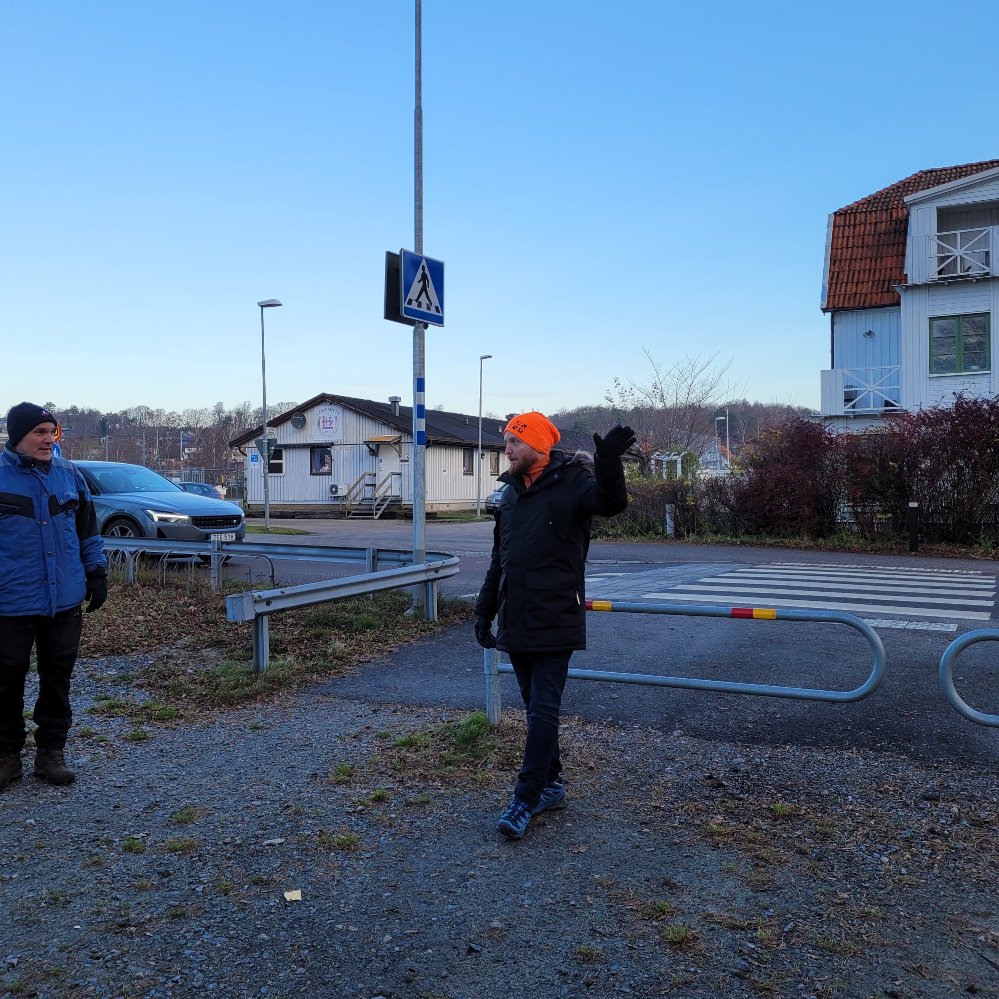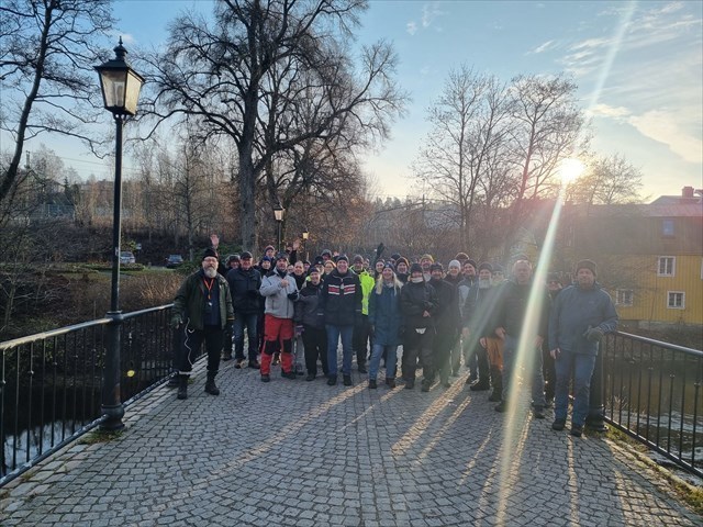 Några närbelägna burkar, inklusive den virtuella ute på piren, blev flitigt besökt av de tillresande geocachare som inte varit på platsen tidigare. Men vad var det vi egentligen stod och väntade på i kylan? Det avslöjade EO efter en stund och det rykte jag hört visade sig stämma. En grupp geocachare hade slagit sig samman och använt sina ALC krediter för att skapa en längre promenad utmed Säveån, totalt 20 stycken ALC:er skulle publiceras vid 11.30 tiden (vilket alltså ger 100 loggar). Redan vid 11.15 började det plinga i telefonen när de första ALC:erna släpptes och snart begav sig det stora sällskapet iväg, vilket förorsakade en mindre trafikstockning på den närbelägna vägen när alla skulle passera! Åtskilliga mugglare tittade också med undran och med skräck på denna folksamling, det verkar inte vara en så vanlig syn i Lerum.