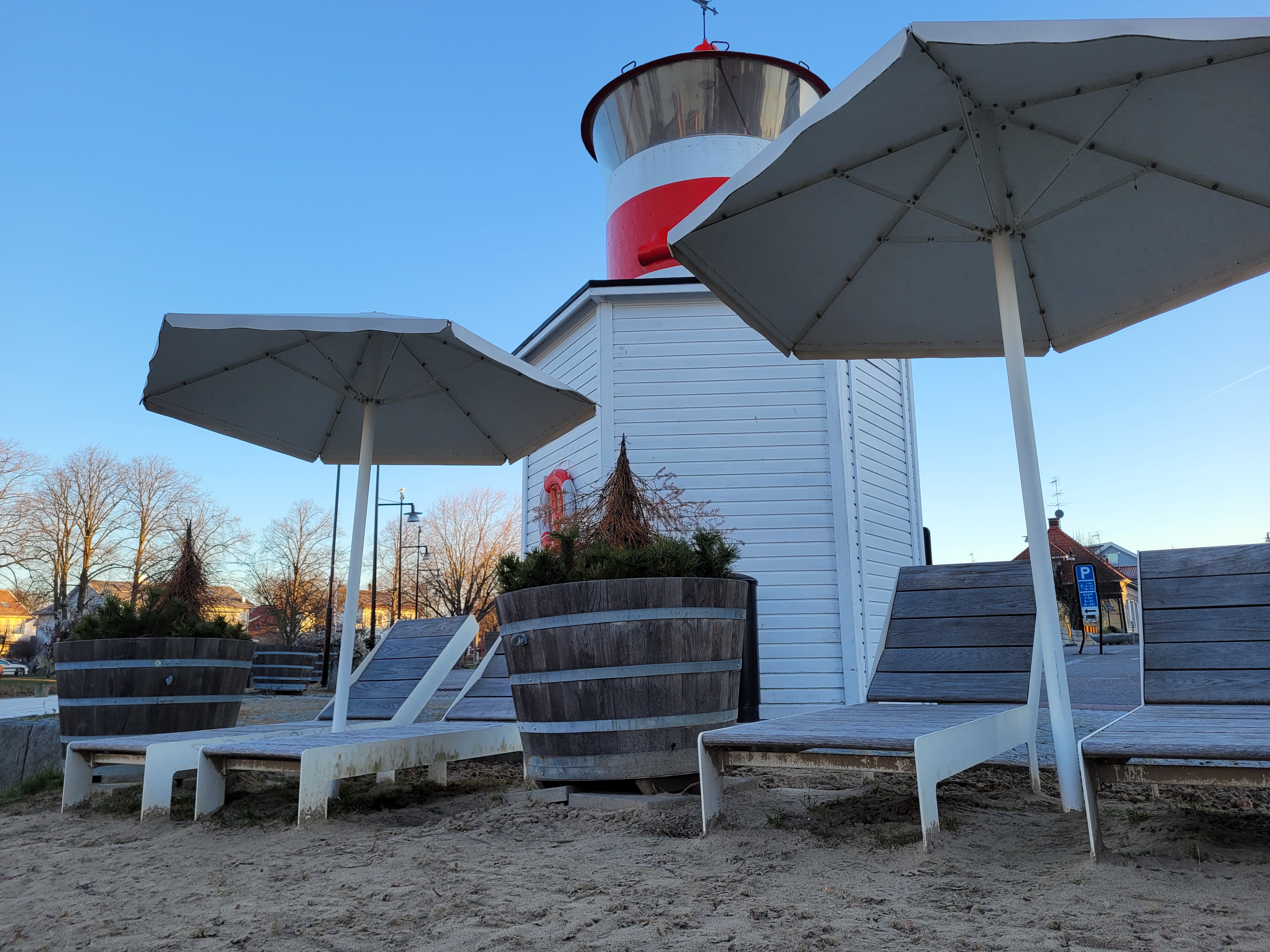 Vid Hamntorget väntade det första av dagens spöken, men solstolar och strand låg öde. Här, mitt i centrum, borde väl ändå några hurtiga badbrudar hålla till. Men icke! Platsen å andra sidan var intressant och det blev en genomläsning av den rekommenderade skyltens text om den livliga sjöfarts- och handelsaktivitet som pågått på denna plats.