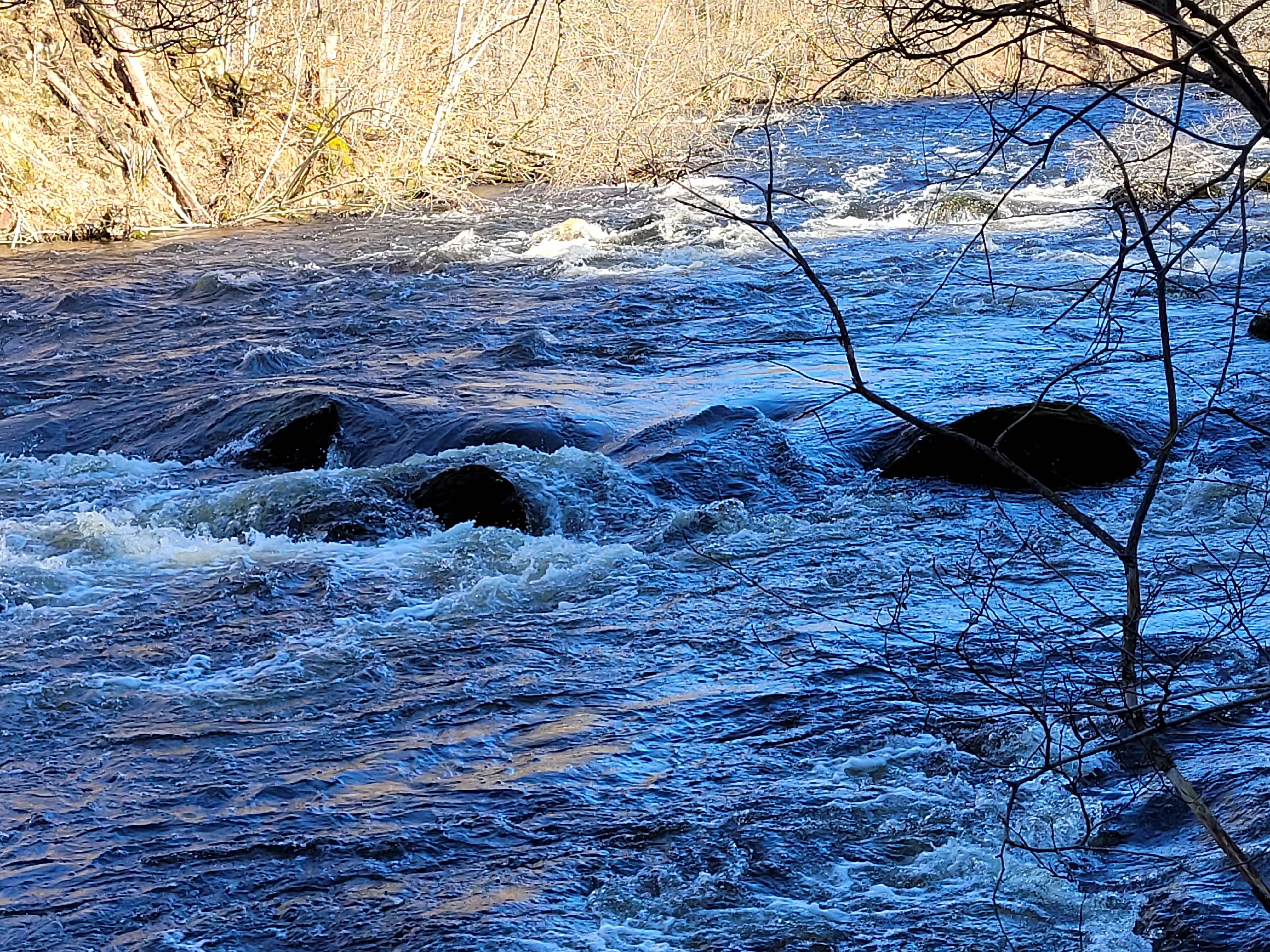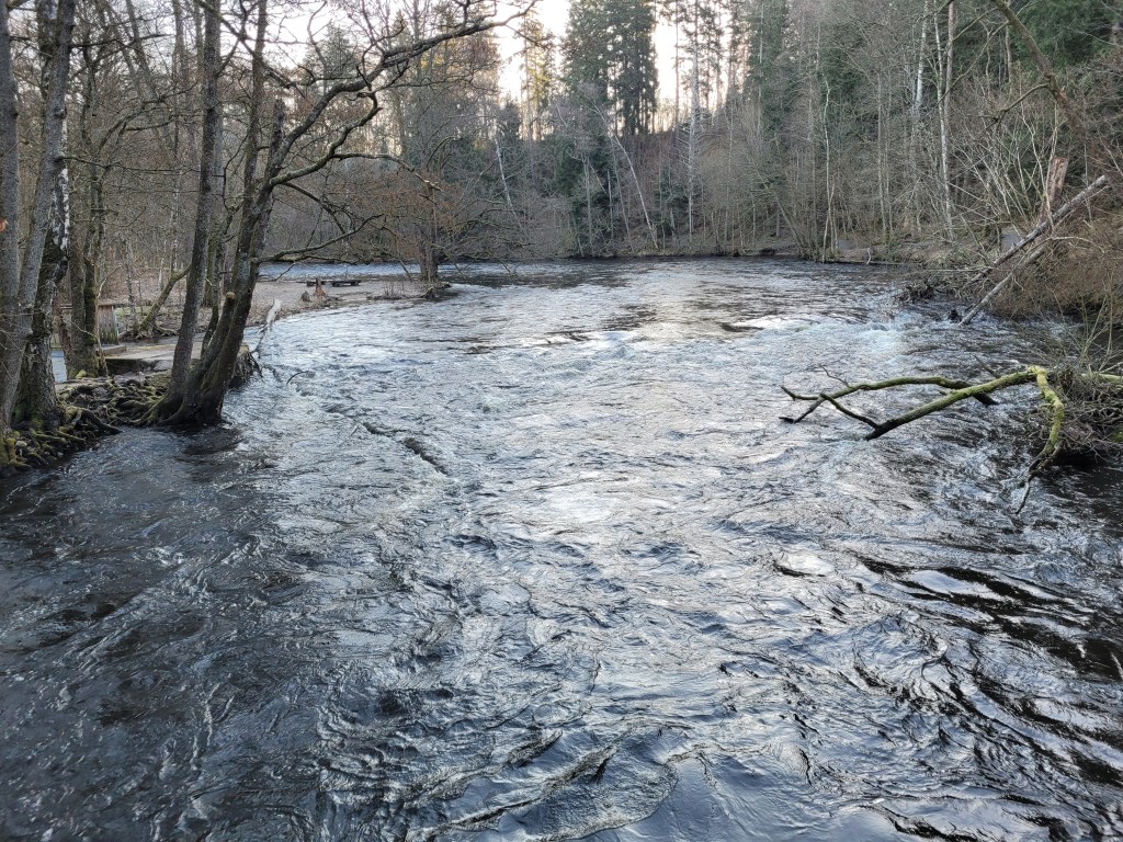 Vandringen tillbaka mot Stenkullen gick utmed Säveån som var välfylld med vatten och forsarna var riktigt vilda. Att julen varar till påska är väl bekant för alla, så en julkalenderburk fick det allt bli denna långfredag. Efter en stunds letande på fel objekt så hittades den något speciella cachen Jul i Lerum #23 – Fira i förväg. Det tog en stund att få fram och tillbaka burken, mer avslöjas inte… När jag var klar och hade gått en bit från cachen så kommer två bilar till parkeringen, ibland har man tur!