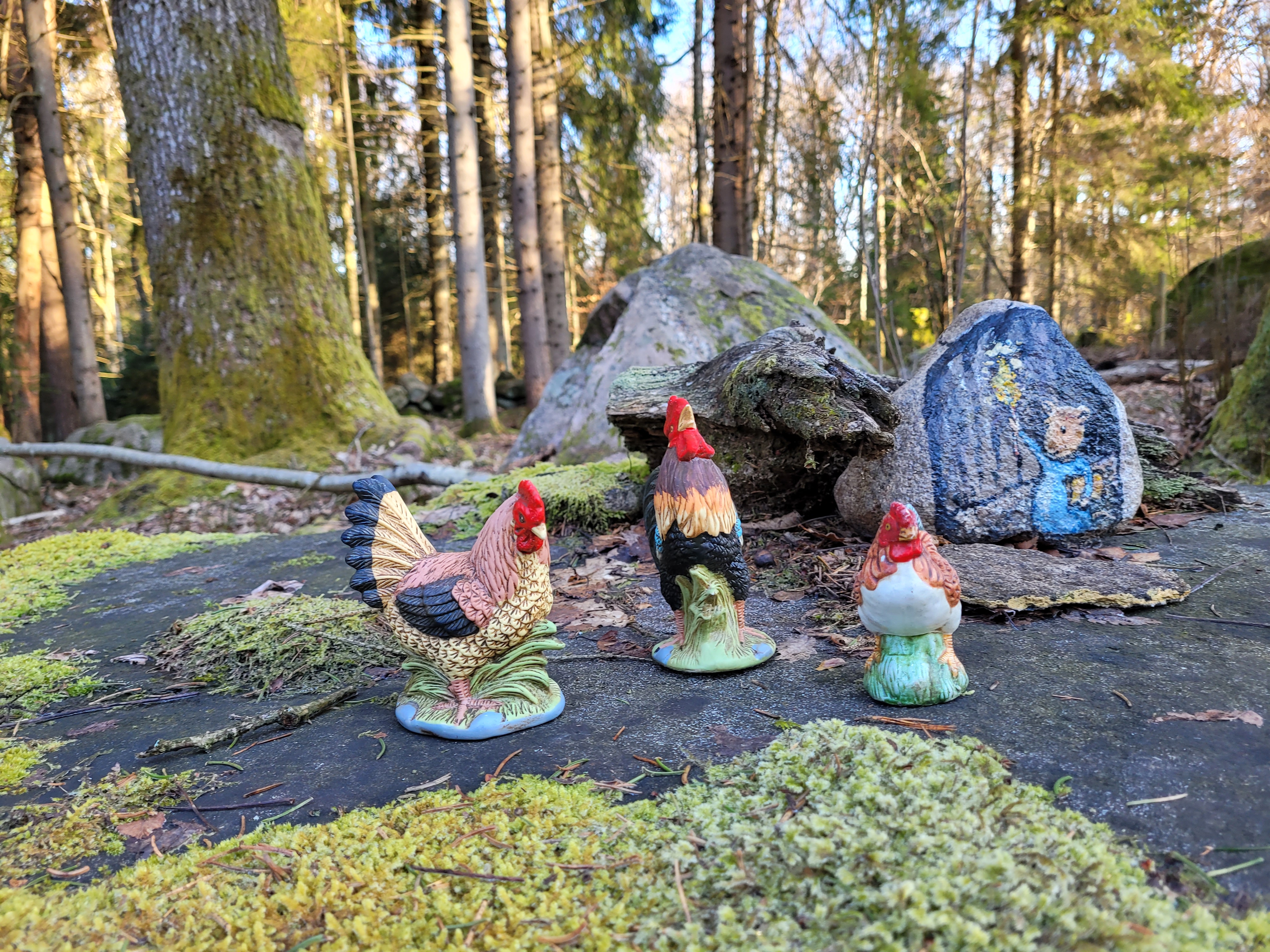 Turen utgick från Stenkullens station då jag tänkte mig att försöka rensa upp bland Forntidsvandringens cacher. Där hade jag några kvardröjande DNF:er men också ett antal nya cacher som skulle besöka. Dessvärre så lyckades det inte heller denna gång med att hitta #4 och #7. Bättre gick det då på #11 till #15 som alla hittades. Det var en del folk och fä ute denna soliga dag och vid #11 iakttog nyfikna befjädrade hästar min aktivitet.