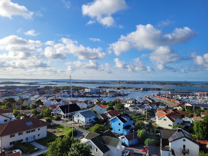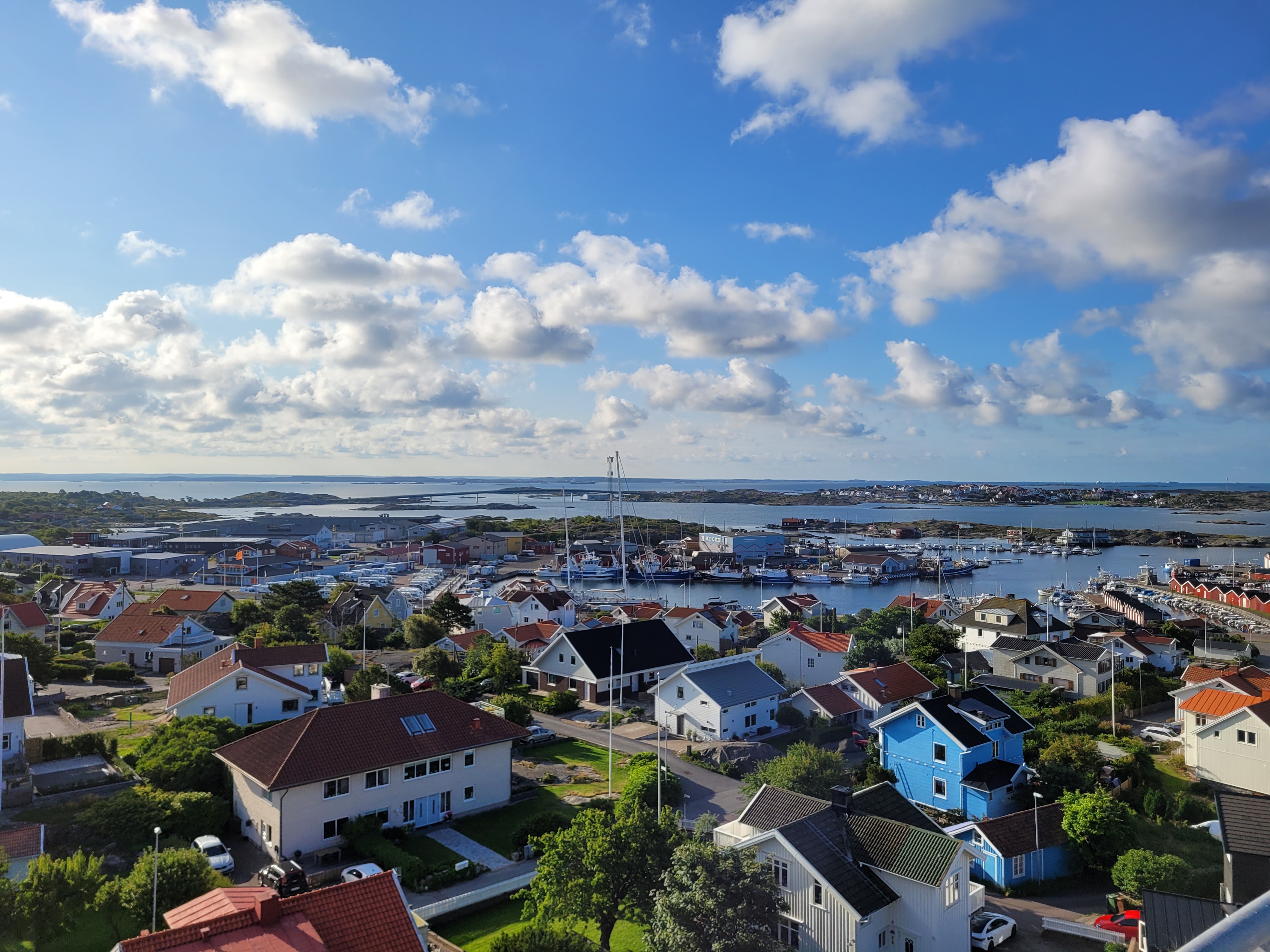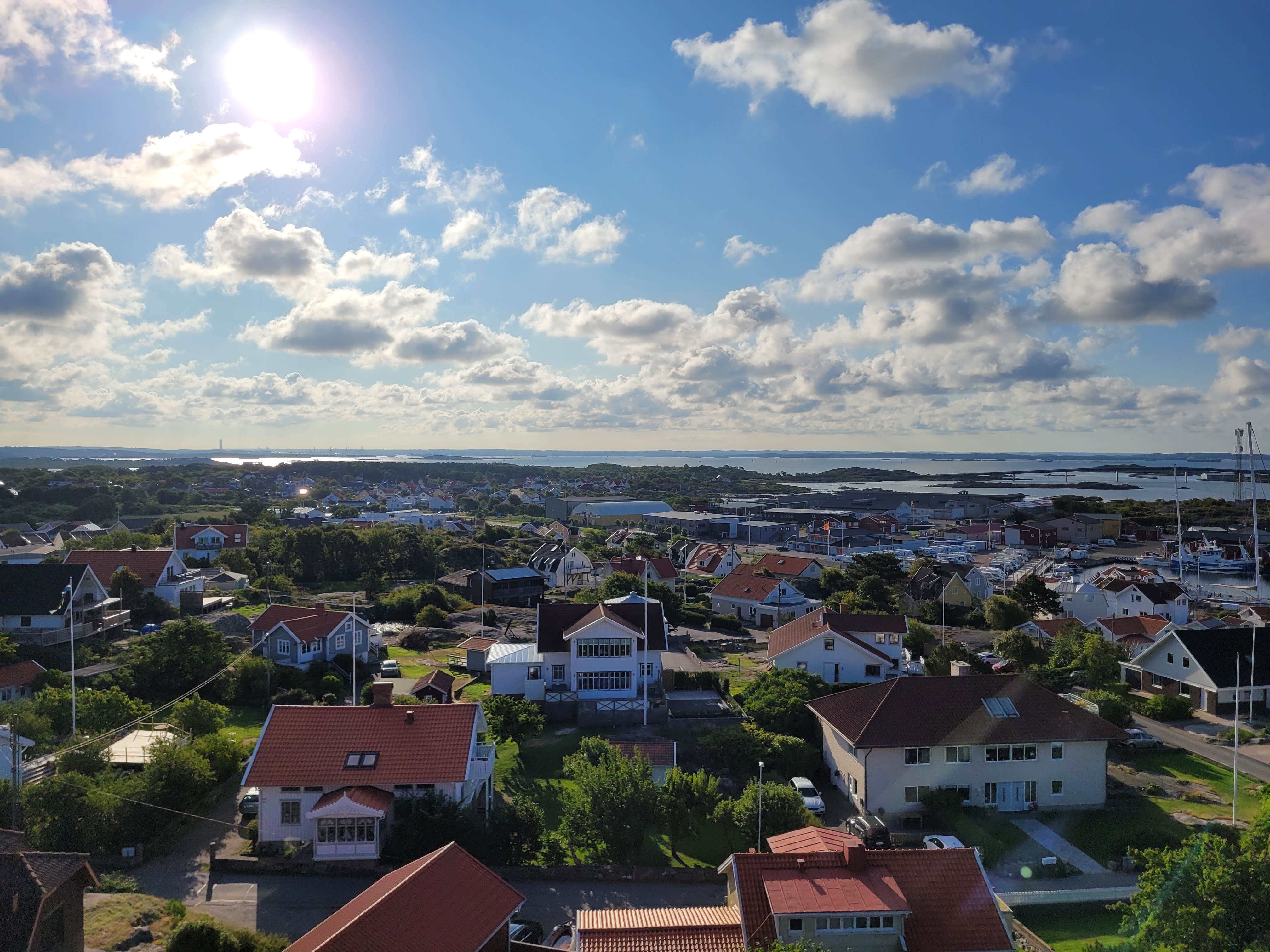 Det fanns gott om plats för Rulle T nära Hönö Klåva hamn där dagens första vandring skulle ta sin början. Där startades ALC appen för att påbörja Hönö Klåva rundan, det första delsteget gick bra att kombinera med den virtuella cachen Hönö Vattentorn. Förutom två loggar på platsen bjöd vattentornet på en enastående utsikt. Stora fartyg var på väg genom farleden till och från Göteborg och Vingas byggnader syntes tydligt vid horisonten.