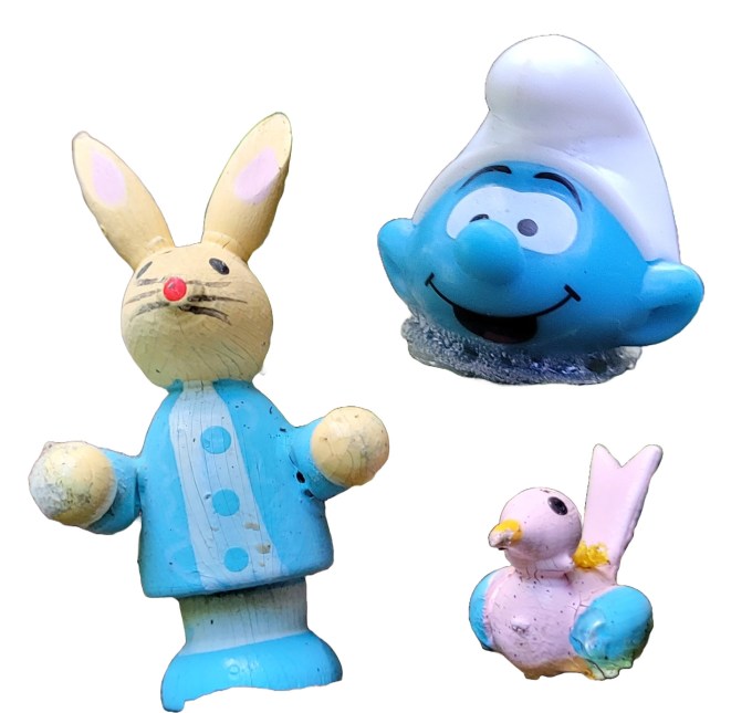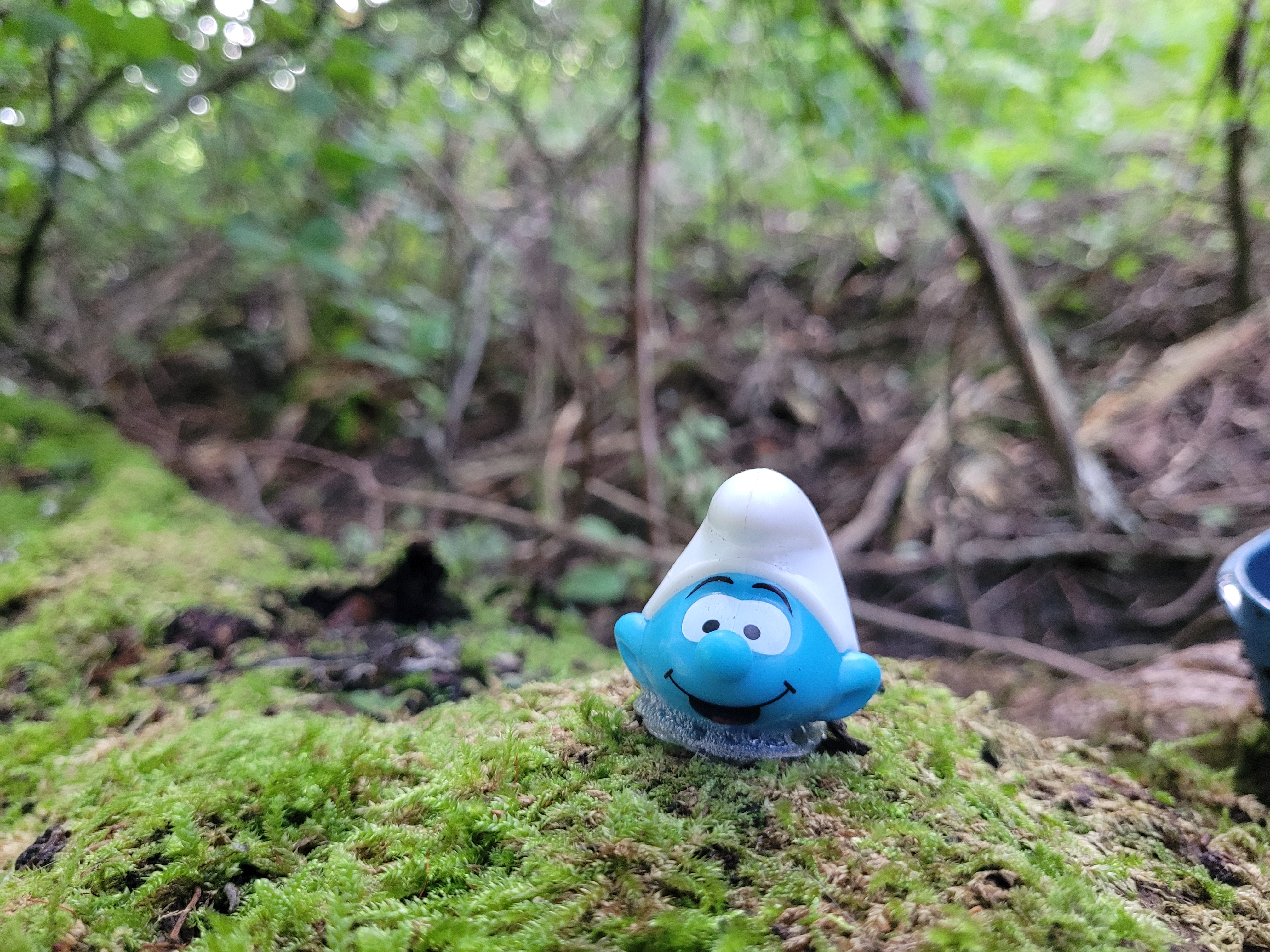 Efter att Rulle T inspekterats – och klarat provet – så var det dags för dagens lite kortare runda ute i Partille där jag tänkte studera både smurfar, påskharar och kanske även något fjäderfä. Utgångspunkten för vandringen blev Kvastekulla och dagens första cache Smurfernas utpost i Partille. Jag snurrade runt lite bland träden innan jag fick syn på en misstänkt plats, och det visade sig vara där lådan låg gömd. Hälsade på smurfen i lådan, signerade loggboken, återplacerade och gick vidare på min färd.