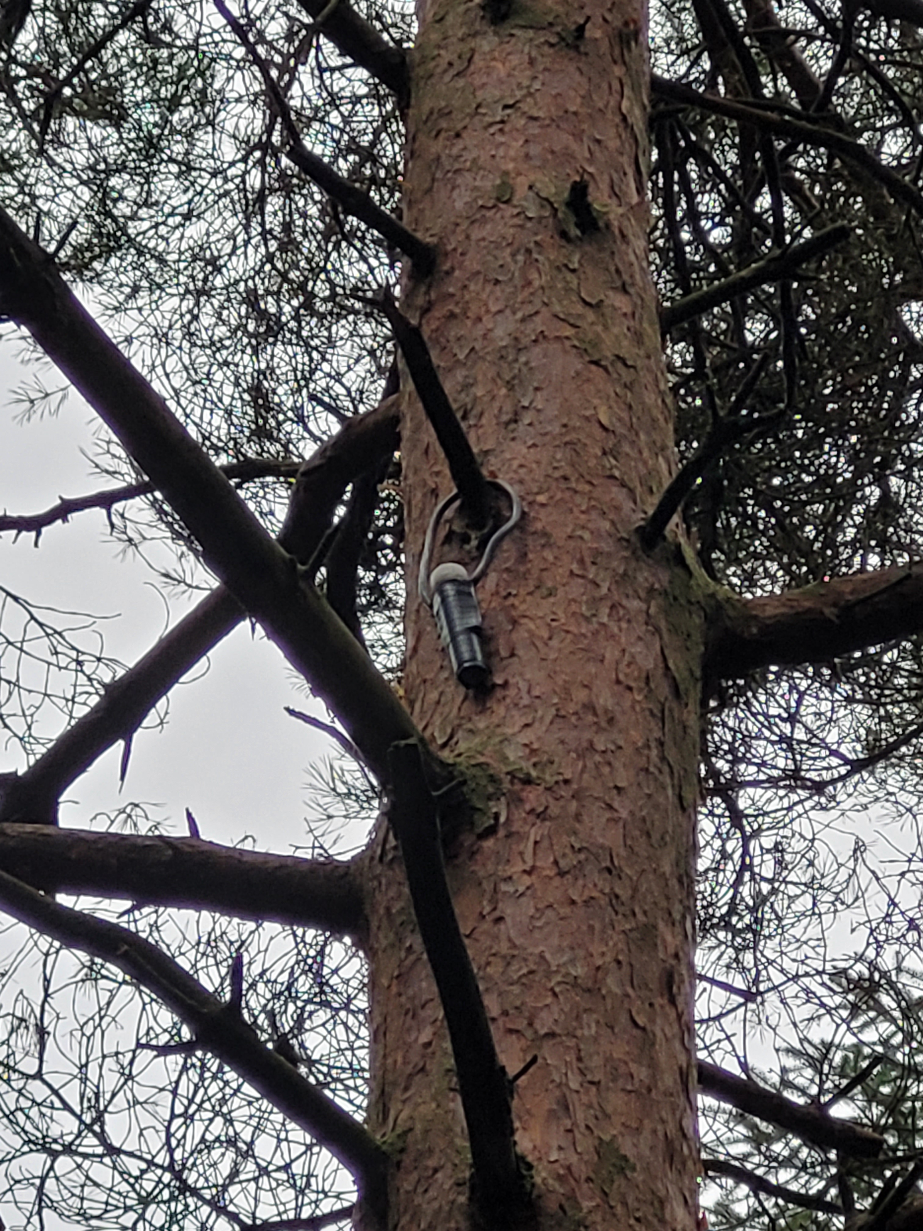 Efter loggning så fick burken åka upp en bit i trädet till en lämplig gren. Därefter gick jag genom stiglöst land mot Fiske mitt i skogen #2. Här hängde burken uppe i sitt träd så som förväntat men inte högre än att jag nådde upp med 7-meters spöt.