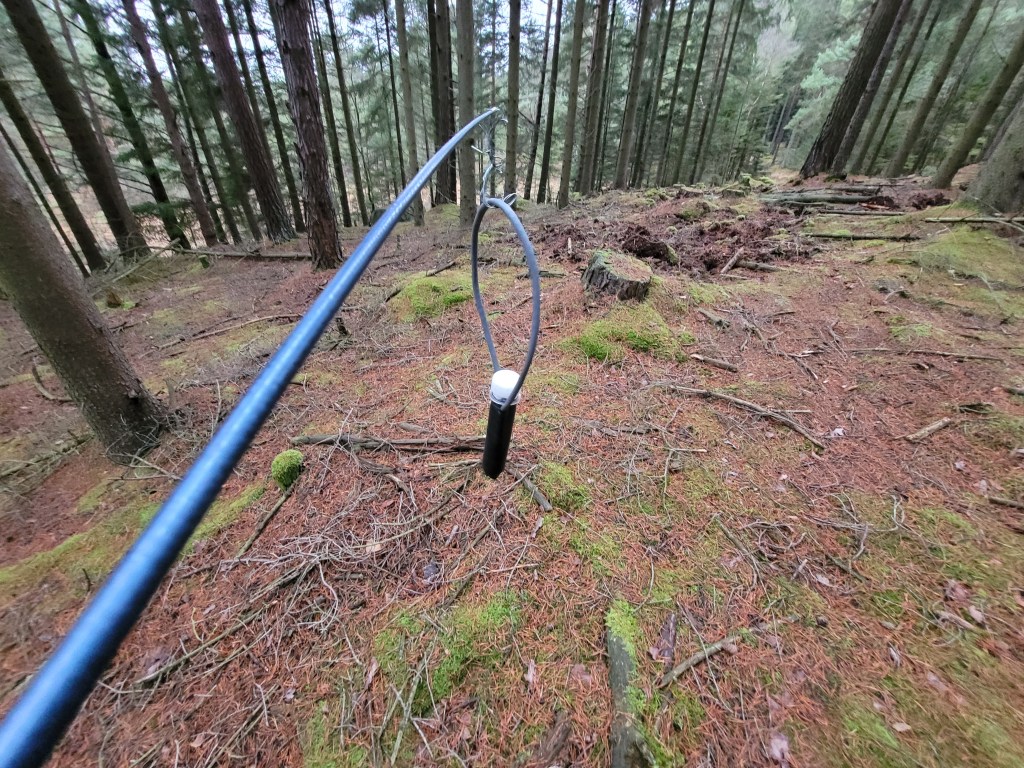 Söndagens geocachingrunda avslutades med en multi, Kulturminne – Röse. Var finalen låg kände jag till sedan tidigare då jag besökte startpunkten för flera månader sedan (!). Då höll färden mot finalen på att sluta riktigt illa. Mossarna i trakten var mer än välfyllda med vatten och jag klev ut på en spång som låg under vatten, den gav vika och jag råkade ut för en luftfärd. Tur i oturen var att jag inte hamnade i vattnet utan enbart i leran… Då bestämde jag mig att avvakta med finalen och återkomma när förhållandena var bättre. Nu var förhållandena bättre och jag tog mig utan problem hela vägen fram till finalen och fick så äntligen loggat även denna multi. Den satt inte så högt upp, men har man spö med sig så måste det givetvis användas.