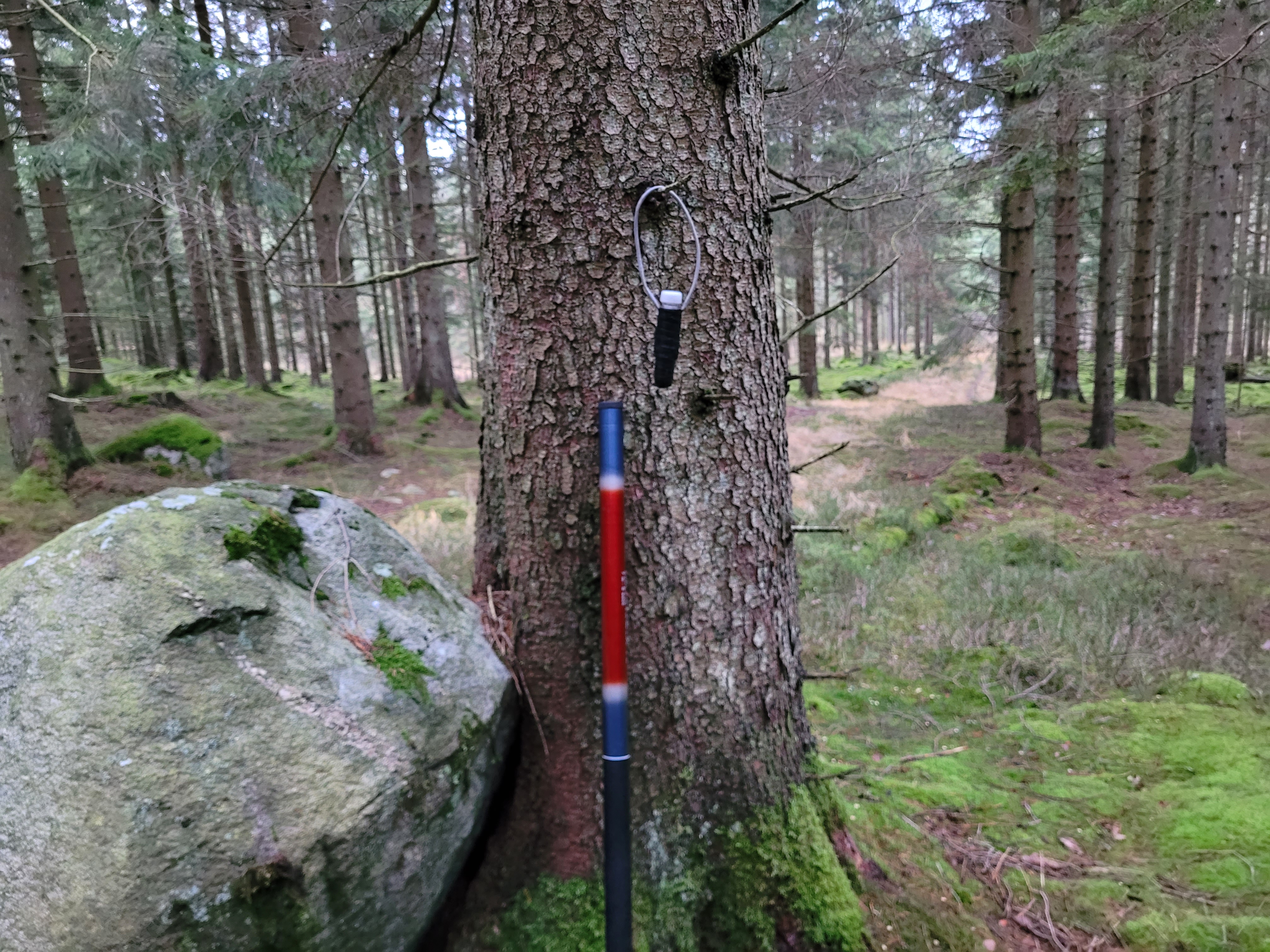 Efter loggning så fick burken åka upp en bit i trädet till en lämplig gren. Därefter gick jag genom stiglöst land mot Fiske mitt i skogen #2. Här hängde burken uppe i sitt träd så som förväntat men inte högre än att jag nådde upp med 7-meters spöt.