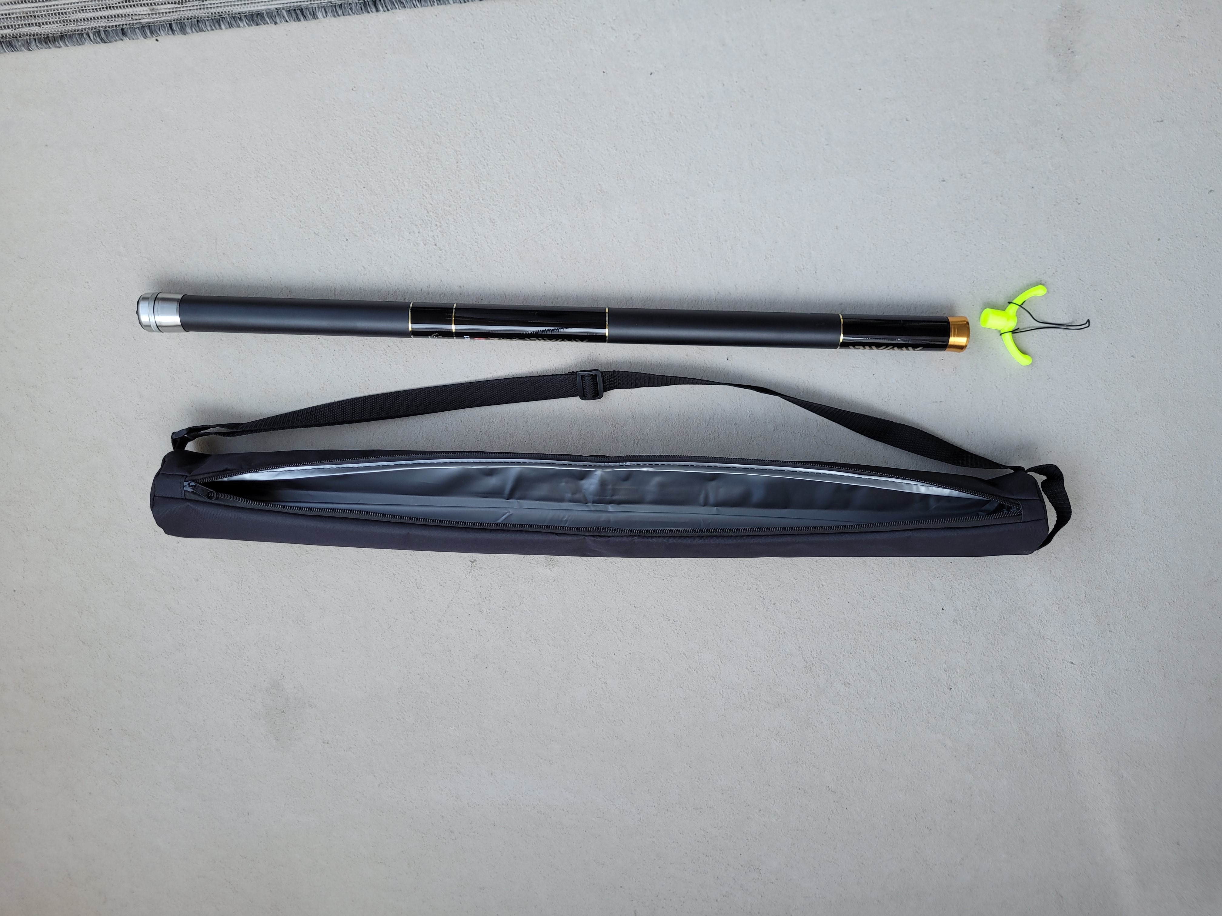 Utöver själva spöt medföljer en bygel som hjälpligt går att använda men det är en fördel att sätta på en egen krok av ståltråd eller liknande material. Det finns även ett antal andra tillbehör som går att köpta extra.