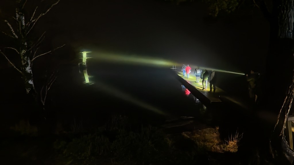 Vi samtalade och utbytte erfarenheter innan det erbjöds en möjlighet att se vem som hade den mest kraftfulla utrustningen, och jag talar då om ficklampor. När den aktiviteten var avklarad avvaktade vi eventslutet då två nya cacher publicerades. Det var en ljusstark samling som gav sig ut på jakt – vilken kväll!