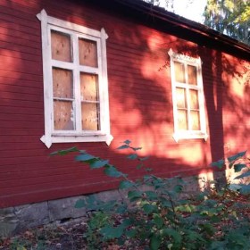 En röd liten stuga i hagen
